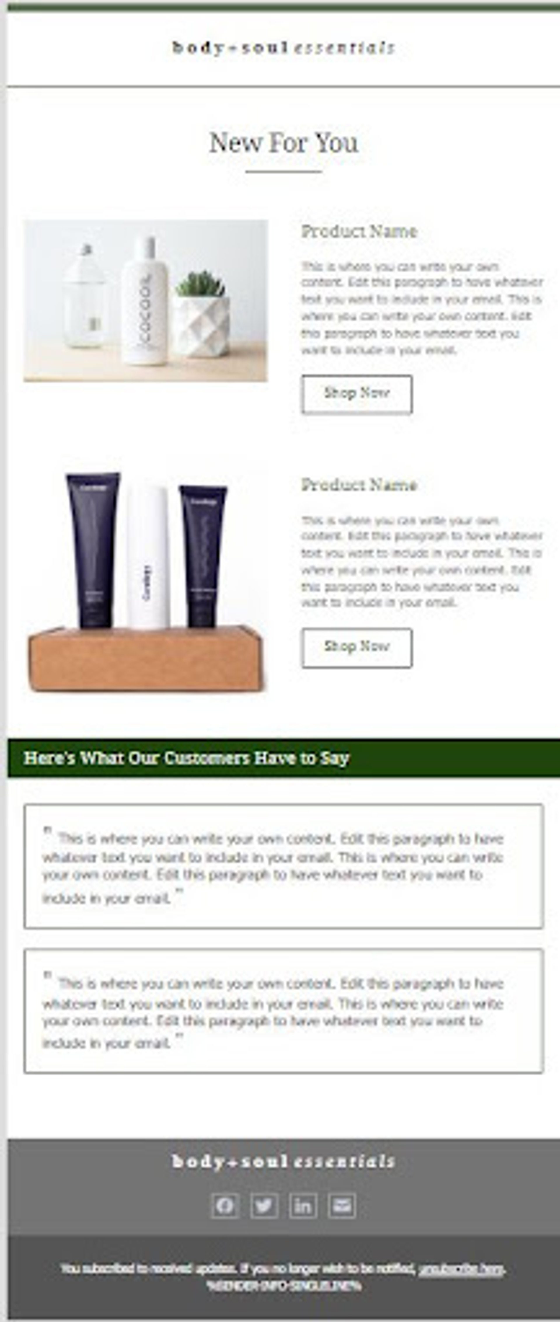 Cette newsletter permet de valoriser les produits ou services de votre enseigne et de raconter leur histoire, une sorte de storytelling de votre fiche produit pour votre site e-commerce. Vous pouvez expliquer pourquoi ce nouveau produit est né, avec quelles matières il est fabriqué, quelle est sa fonction préférentielle, etc. Une newsletter représente votre image de marque, votre fonctionnement et aussi votre histoire. C'est votre histoire qui inspire vos abonnés et qui crée un lien émotionnel et affectif fort avec votre marque. Les clients veulent faire des achats qui ont du sens et souhaitent se reconnaître dans les valeurs d'une entreprise avant de s'engager dans un parcours d'achat, et ce encore plus lors d'une vente en e-commerce. Grâce à votre newsletter, vous allez apporter du sens à vos nouveaux produits ou vos services.