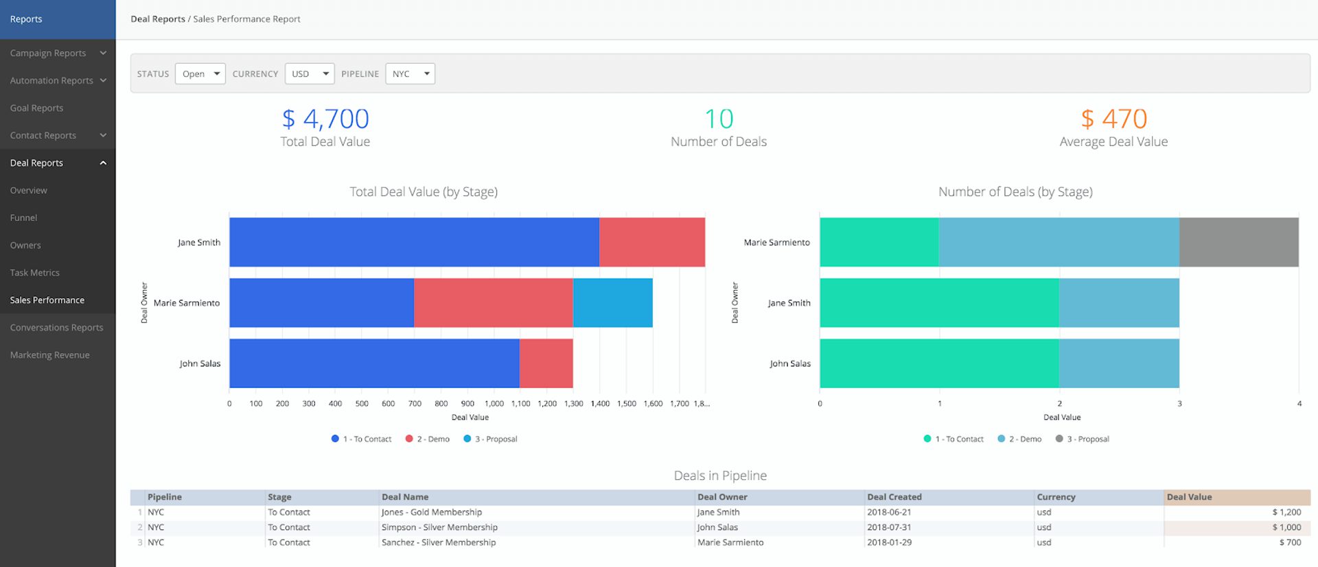 - Des graphiques en barre illustrent la valeur des transactions par étape et le nombre de transactions pour chaque membre de l’équipe commerciale.