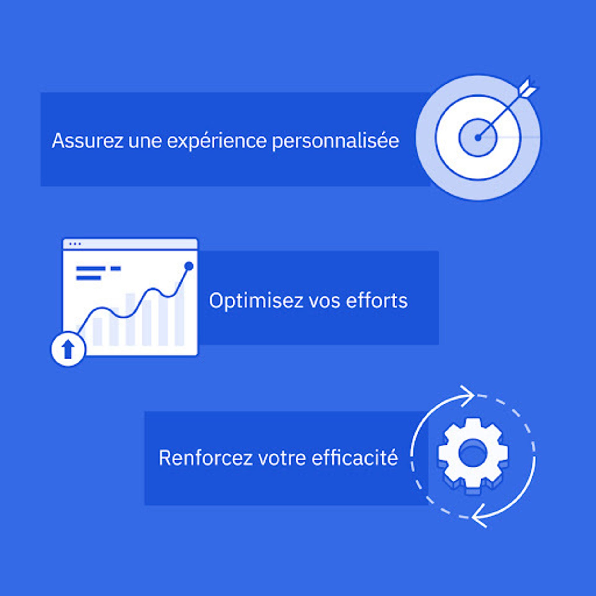 - Améliorer le rendement (et la réduction des coûts) : optimisation des dépenses en gestion des ventes grâce à un meilleur ciblage et l’automatisation de l’ensemble des activités commerciales et marketing.