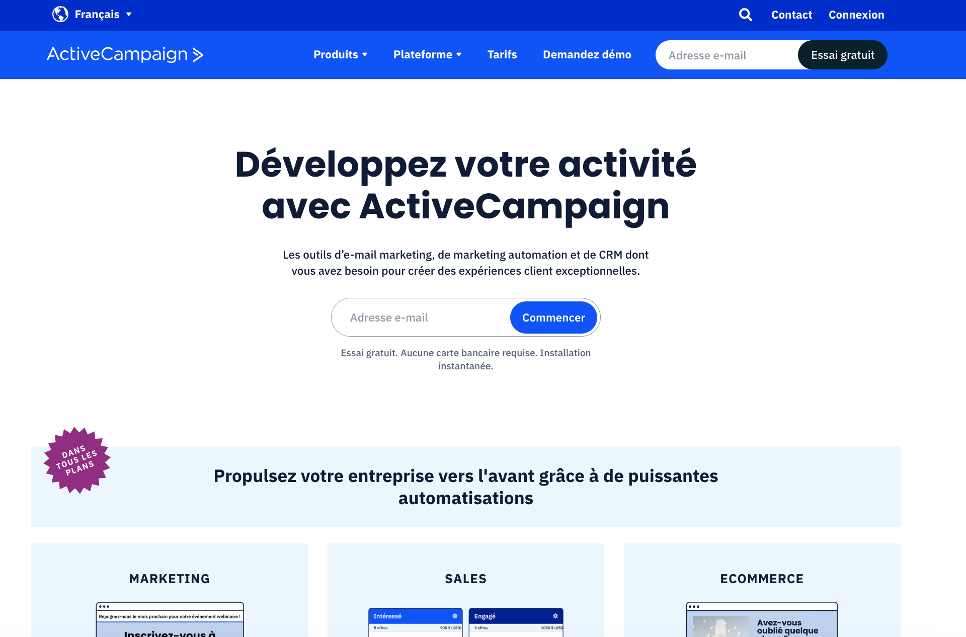 ActiveCampaign est une puissante plateforme, vous permettant une automatisation totale, des e-mails aux réseaux sociaux en passant par le suivi des comportements. Nos plans s’adressent aux entreprises de toutes tailles, mais notre logiciel d’automatisation est particulièrement destiné aux petites et moyennes entreprises à la recherche d’une plateforme facile d’utilisation afin d’amplifier leurs efforts de marketing.