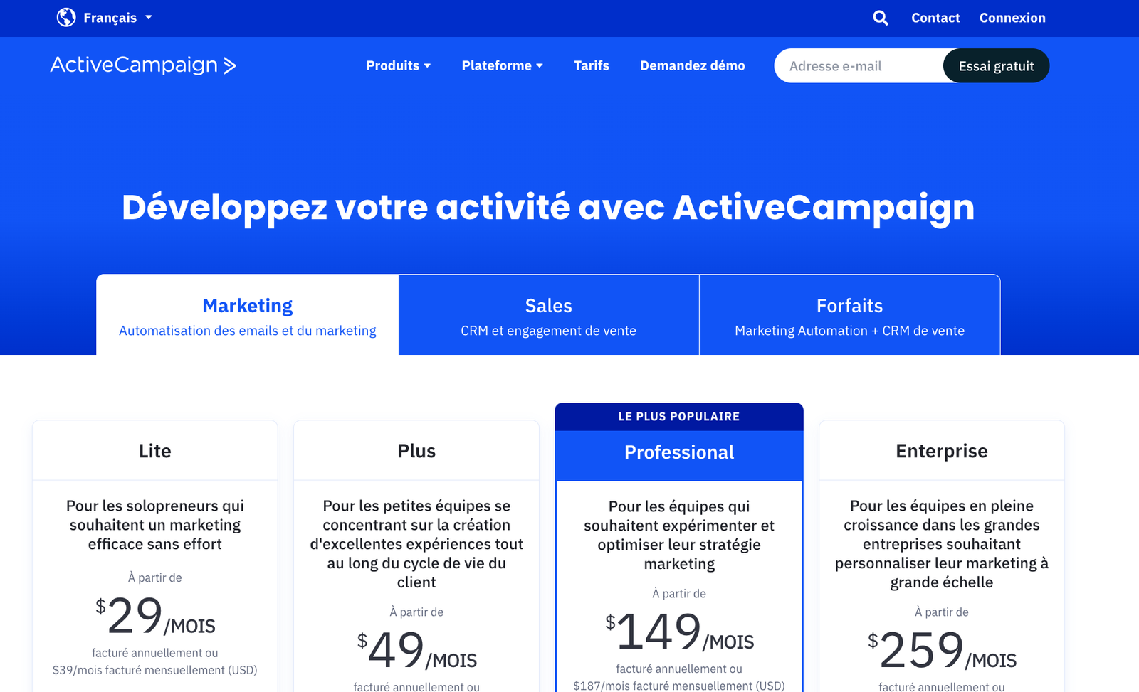 ActiveCampaign propose 4 plans, à la tarification juste selon le nombre de contacts que vous avez. Vous trouverez ci-dessous les tarifs de plans pour 1 000 contacts.