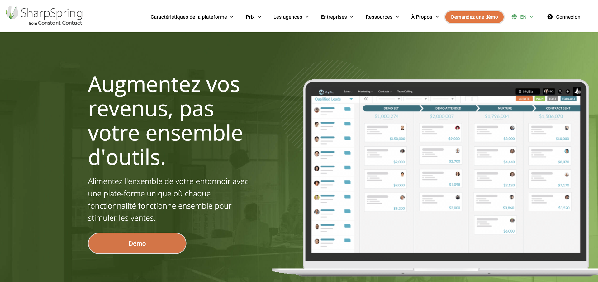 SharpSpring est conçue pour rassembler au même endroit votre automatisation des ventes, votre Marketing Automation et votre gestion de la relation client. Elle offre des fonctionnalités pour les e-mails, les annonces publicitaires, les pages de renvoi, les médias sociaux et plus encore.