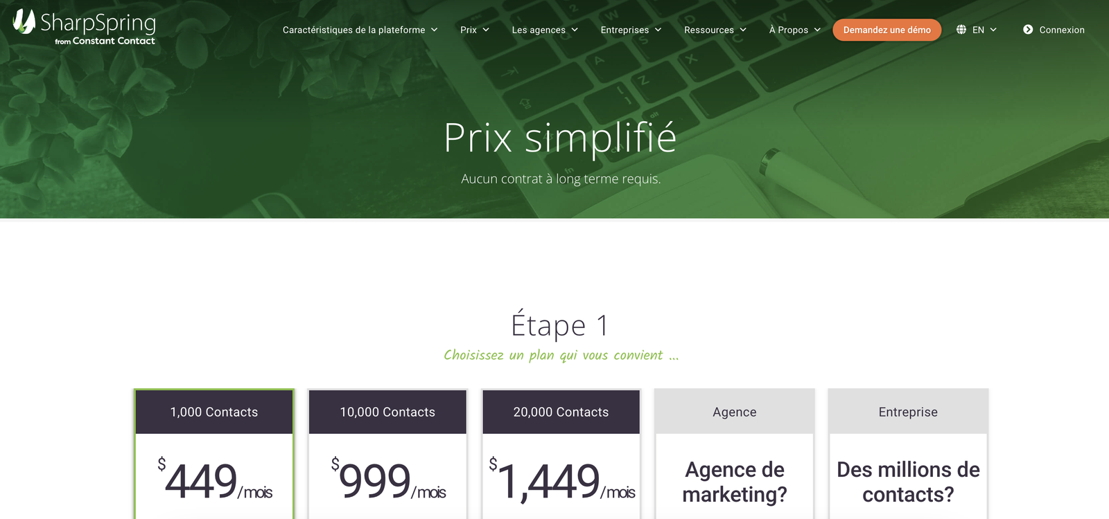 Pour les petites et moyennes entreprises, SharpSpring propose 3 plans selon votre nombre de contacts. Les agences et les entreprises doivent contacter la plateforme pour connaître ses tarifs.