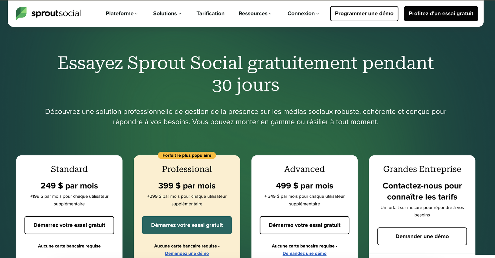 Sprout Social propose 3 plans, facturés en fonction du nombre d’utilisateurs, avec un essai gratuit de 30 jours.