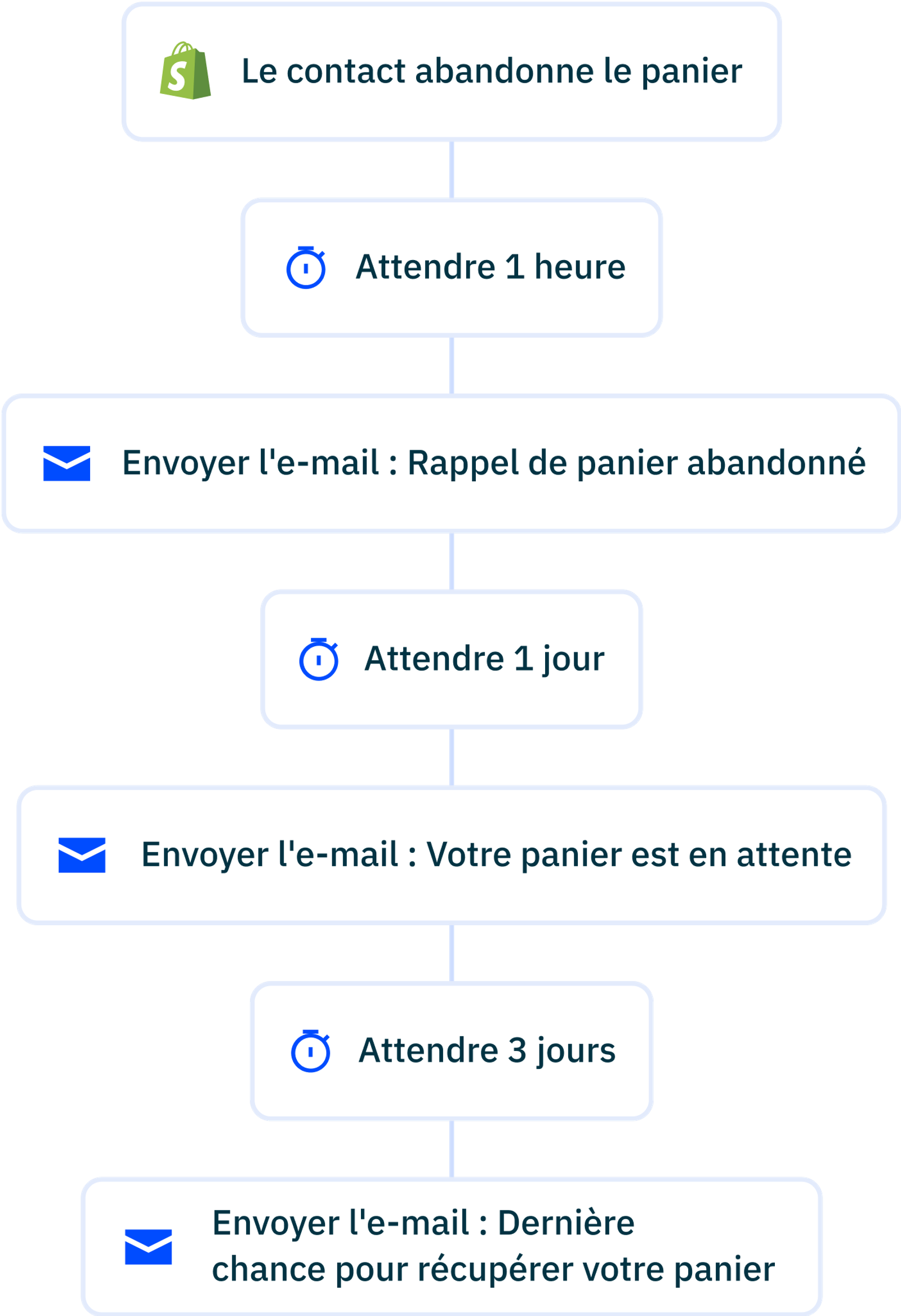 Supposons qu’un client potentiel abandonne un panier dans votre boutique en ligne. Au lieu d’utiliser le temps de votre équipe de marketing pour les relancer individuellement (ou pire, ne pas les relancer du tout), l’automatisation du retargeting vous permet d’envoyer un e-mail après une période définie. Testez différentes façons d’inviter vos clients potentiels à reconsidérer un article.