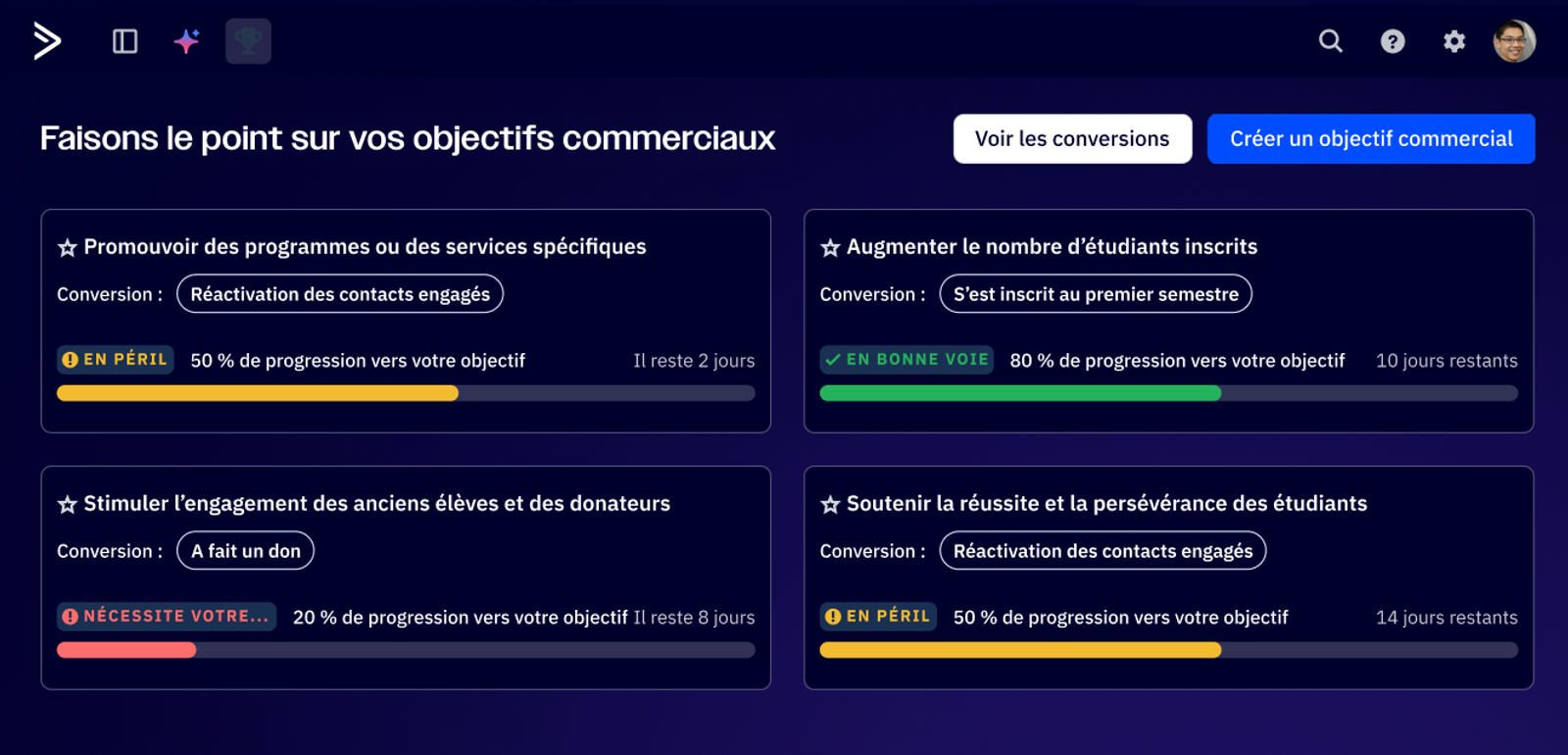 Plutôt que de gérer les campagnes et les automatisations comme des initiatives distinctes, les objectifs commerciaux vous permettent de regrouper toutes ces activités sous un même objectif commercial. De même, la veille orientée sur les objectifs vous permet de suivre les performances de la campagne en temps réel afin de pouvoir procéder à des ajustements à la volée. Par exemple, si vous souhaitez augmenter votre base d’abonnés jusqu’à un certain nombre d’ici la fin du mois, le système suivra vos progrès et proposera des suggestions pour vous aider à atteindre vos objectifs.