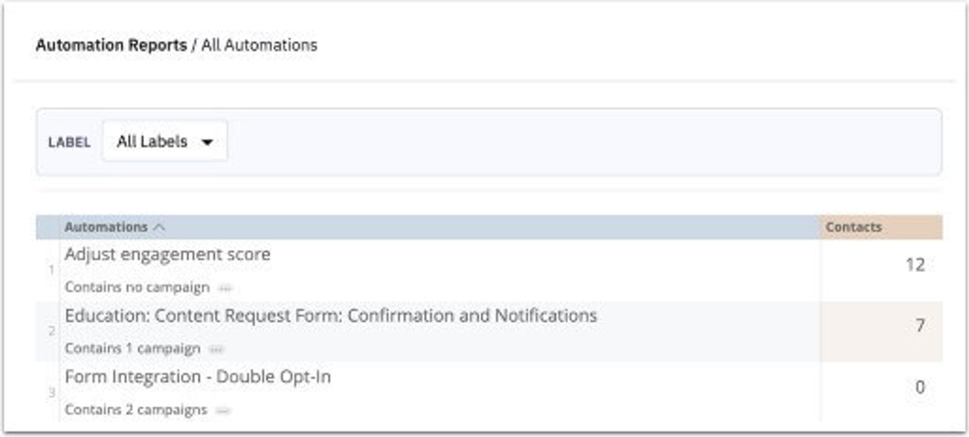 Le rapport sur l'automatisation affiche une liste de toutes les automatisations mis en place, notamment le nombre de campagnes et le nombre de contacts qui y sont relatifs. Si vous utilisez beaucoup d'automatisations, vous pouvez filtrer par étiquette pour trouver celui que vous voulez.