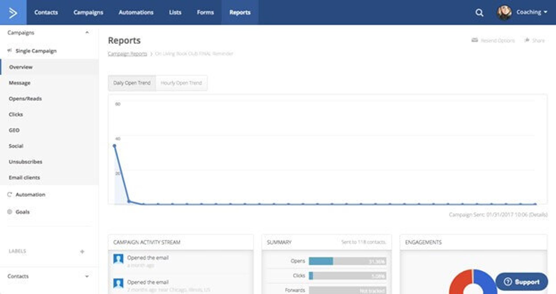 Le rapport sur les résultats de campagnes vous permet de voir les données de toutes les campagnes d'e-mail marketing envoyées de votre compte. Il affiche le nombre d'envois, d'ouvertures, de clics, de désabonnements, de rebonds, et bien plus.