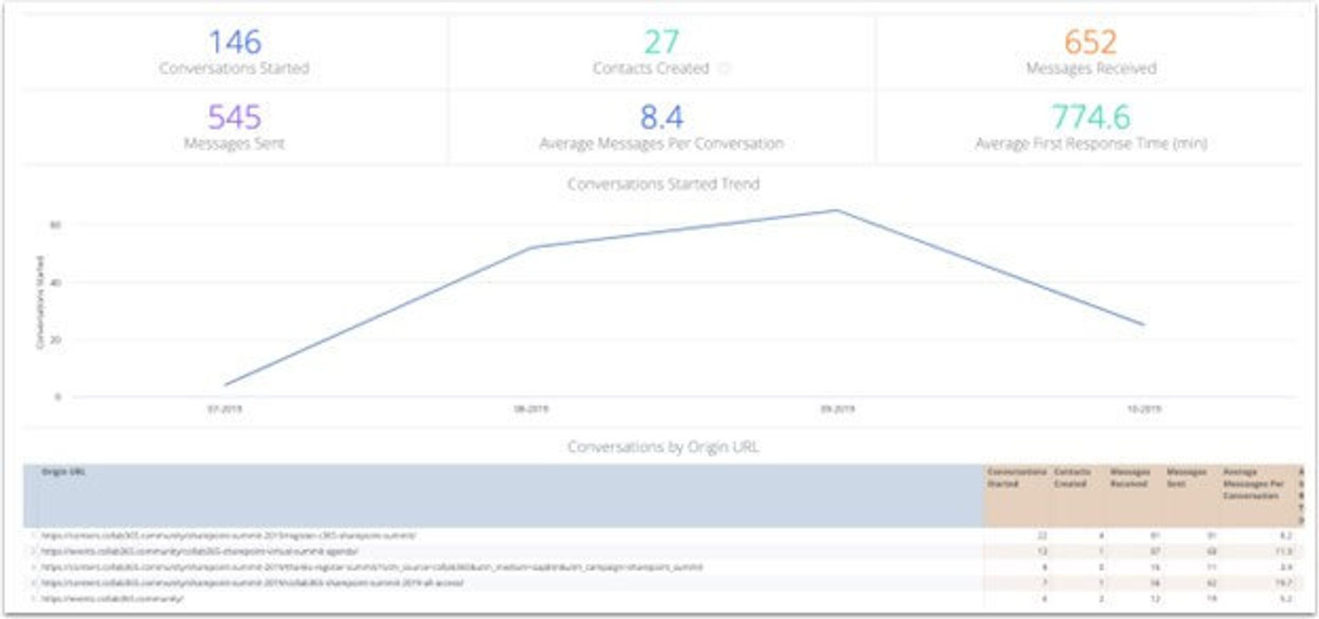 Le rapport sur les conversations par chat affiche les paramètres de toutes les interactions se produisant via la plateforme Conversations. Vous pouvez voir l'URL d'origine des conversations, le nombre de contacts acquis, les temps de réponse moyens et les types d'appareils les plus couramment utilisés.