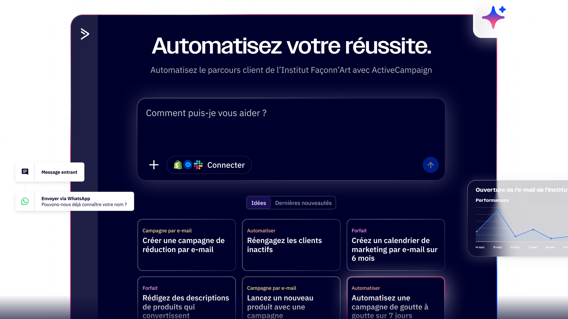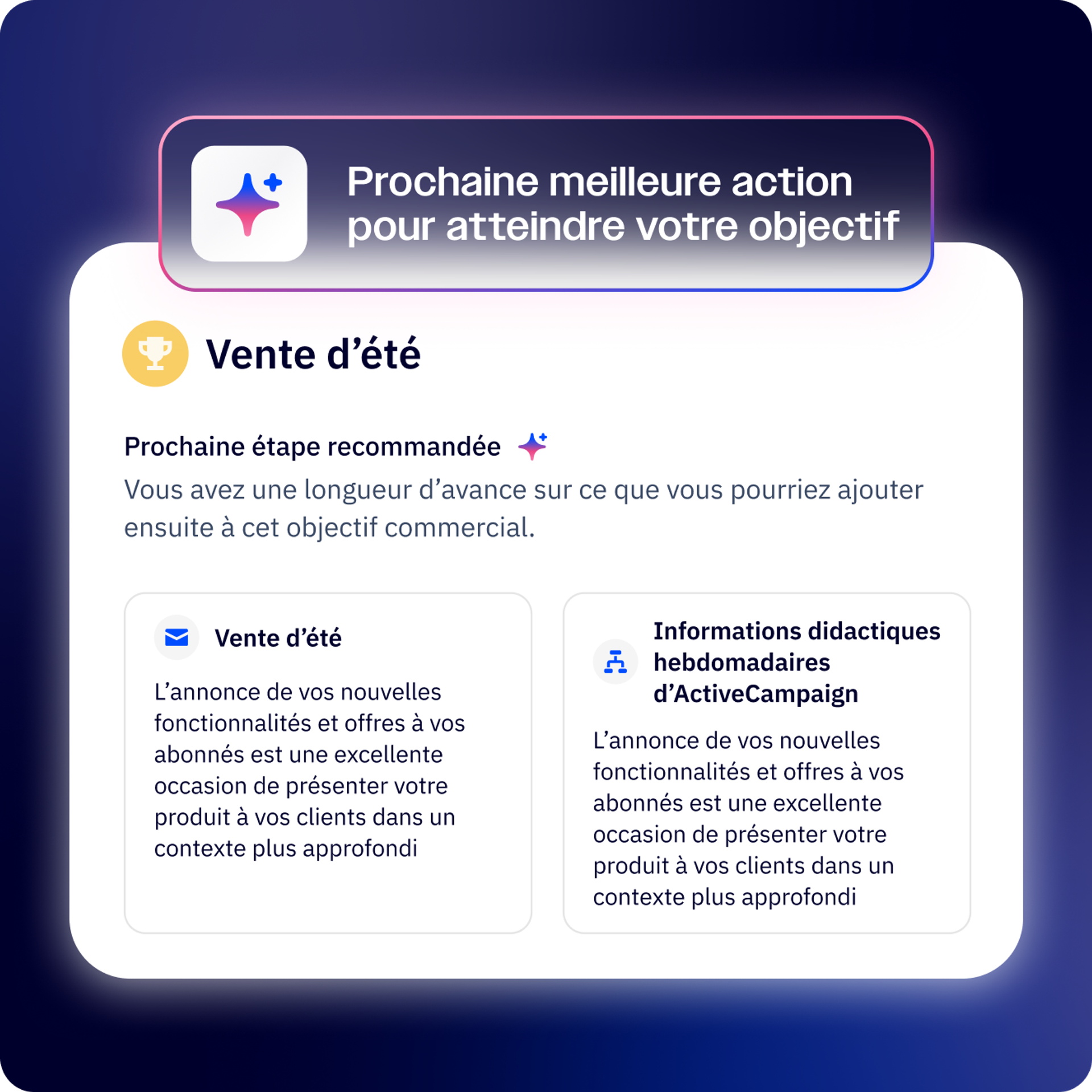 Demandez à l’IA quelles sont vos opportunités avec le plus d’impact dans vos initiatives marketing. Vos agents fourniront instantanément une réponse pensée pour vous mener au succès.