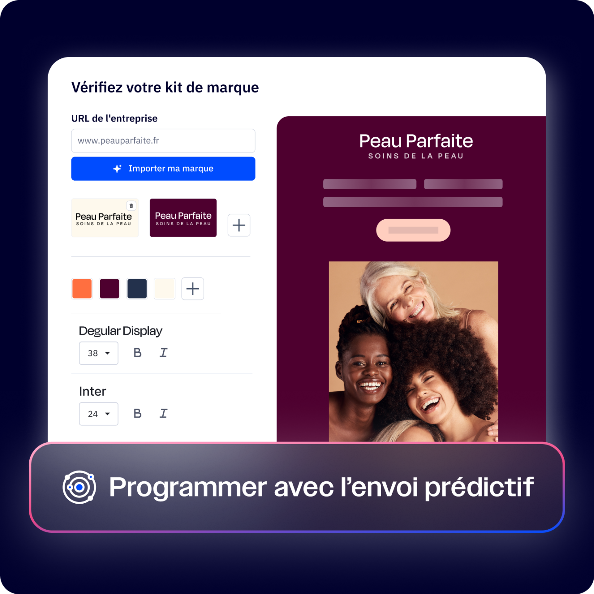 Oubliez le formatage et passez directement à l’envoi. Importez votre identité de marque depuis votre site web en quelques secondes.