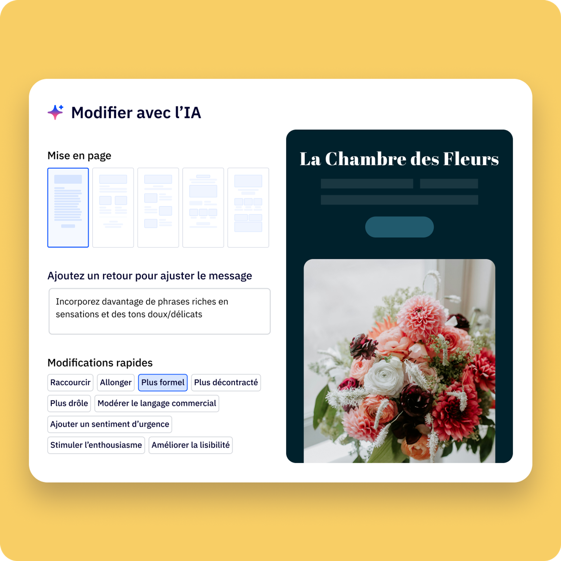 Arrêtez les réflexions excessives et concentrez-vous sur la commercialisation. Notre éditeur de campagnes avec l’IA prend vos idées et crée pour vous des campagnes complètes en quelques minutes.