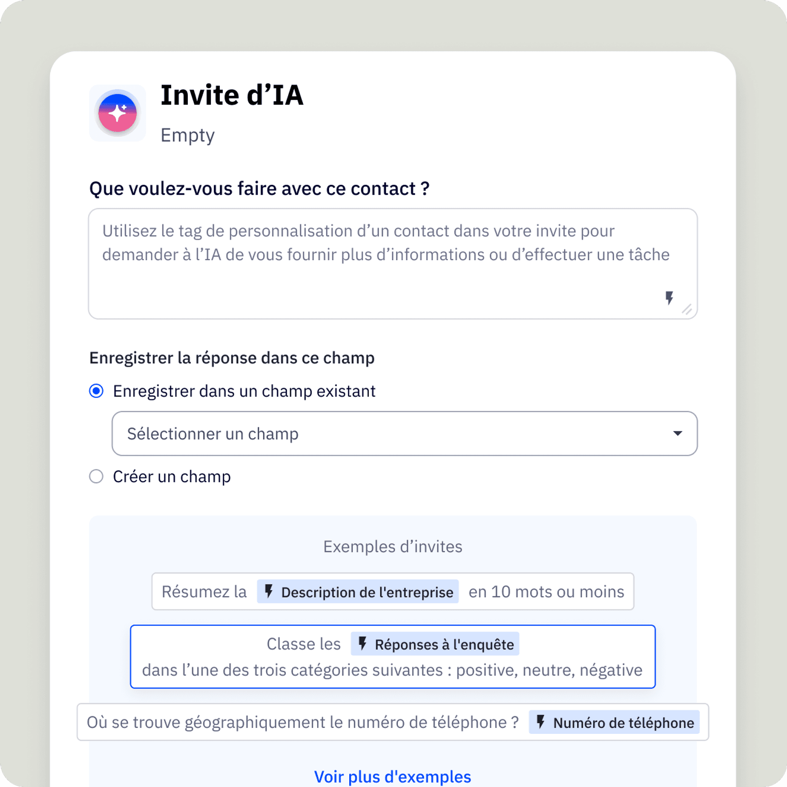 Coordonnez des tâches complexes dans un langage simple et conversationnel grâce au bloc d’invites IA. Il vous suffit de rédiger vos instructions et de laisser l’IA s’occuper de la partie difficile à votre place.