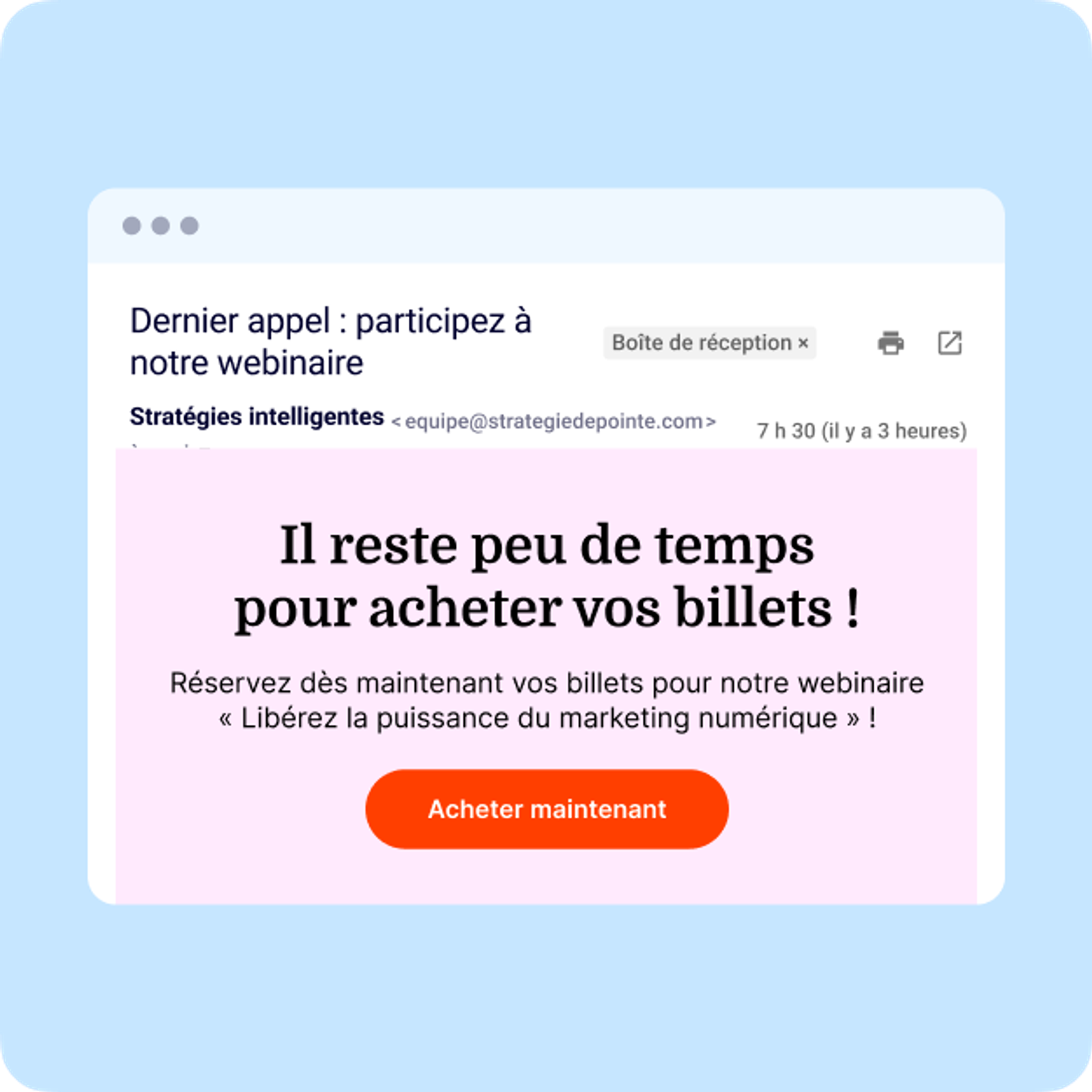 Notre approche axée sur l’automatisation vous permet d’offrir des expériences plus solides et plus personnelles à chaque client, que vous en ayez un ou un million. Augmentez les taux d’ouverture grâce au meilleur taux de délivrabilité sur le marché et à un contenu adapté aux besoins et aux centres d’intérêt de votre audience.