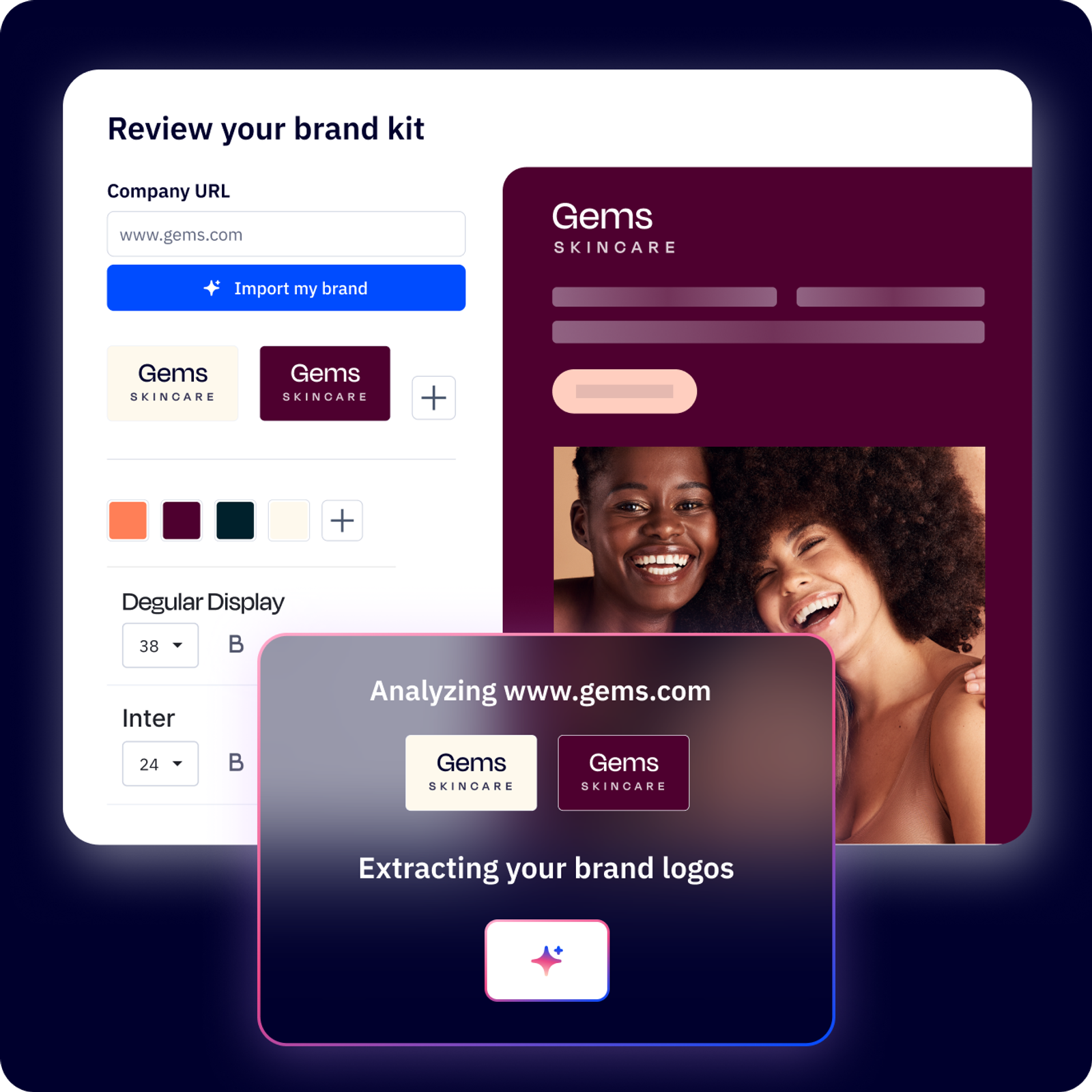 Import your brand in seconds. Use AI to automatically import your Brand Toolkit and distribute it, so that every location can create on-brand promotions in minutes.