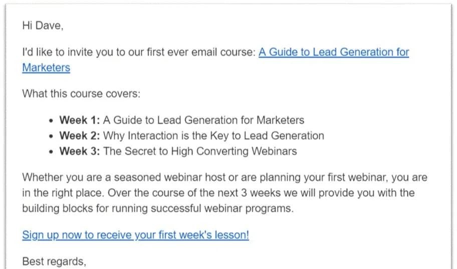 However, drip campaigns can be intentional if customers opt into a specific email chain, like this: