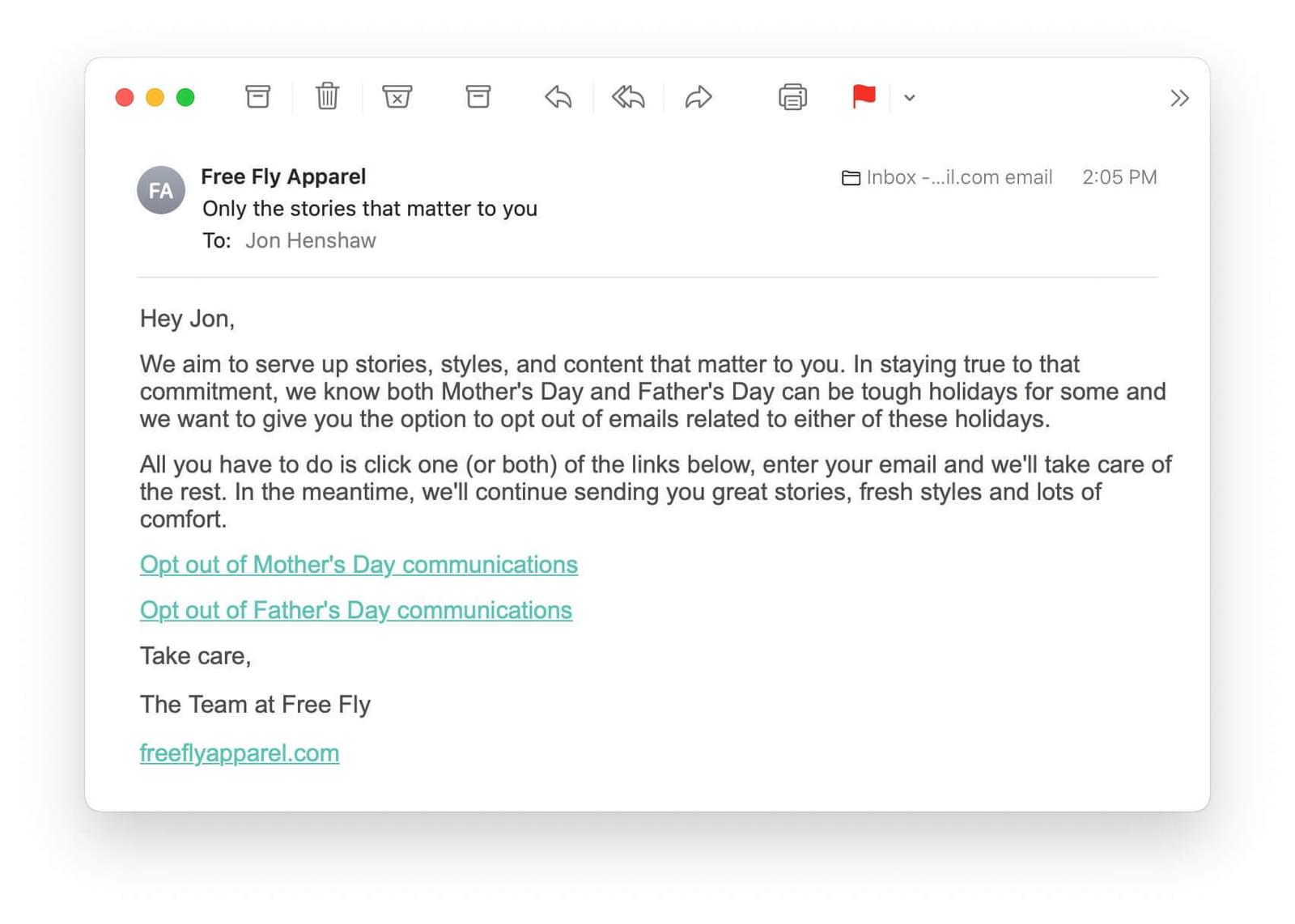 Certain holiday promotions can hit your subscribers harder than others. So, as a part of your email automations, it’s recommended to build in strategic “opt-outs” so subscribers can stay on your email list without receiving triggering emails. Here’s a great example from Free Fly Apparel: