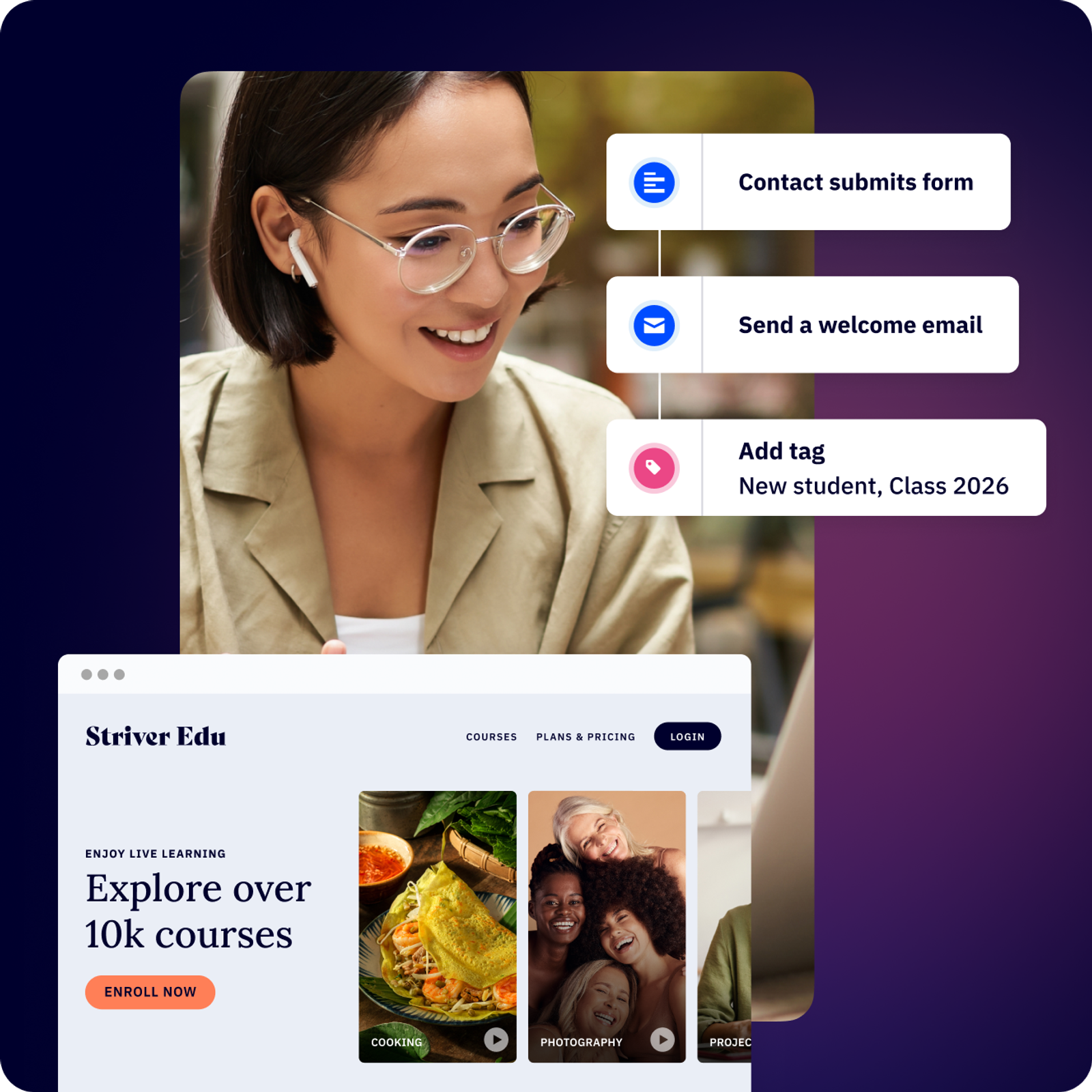 Use autonomous marketing to automatically attract students, send personalized course recommendations, and follow up with leads—so you spend less time on marketing tasks and more time creating content your students love.