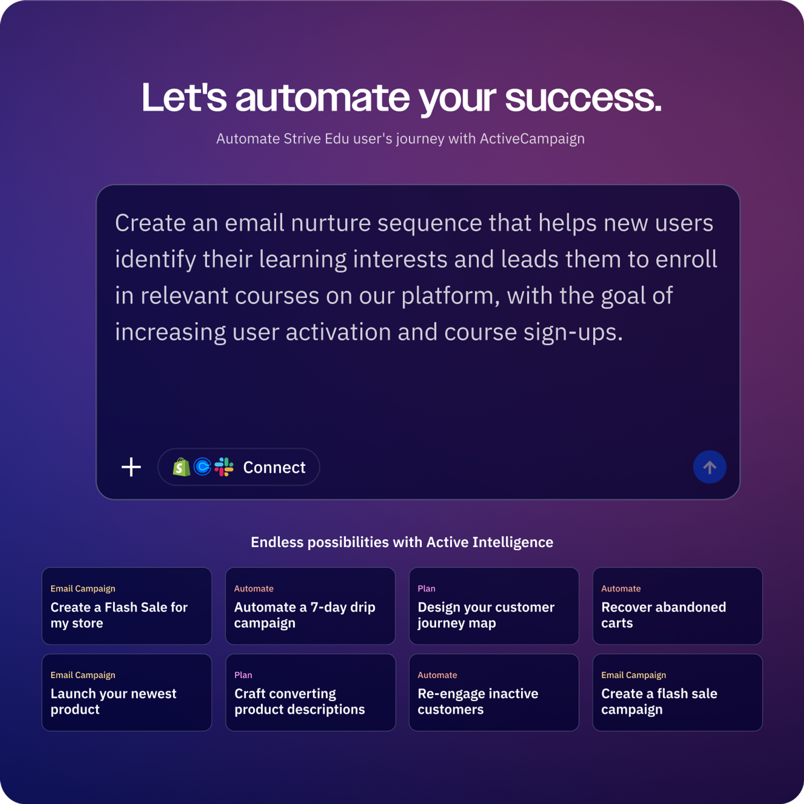 Whether this is your first time building an automation or your 500th, ActiveCampaign helps you get started in seconds. Now you can skip the manual work of building complex automations. Simply type out your goals, and Active Intelligence creates an automation for you. Easily edit the results as much as you like, then set it live.