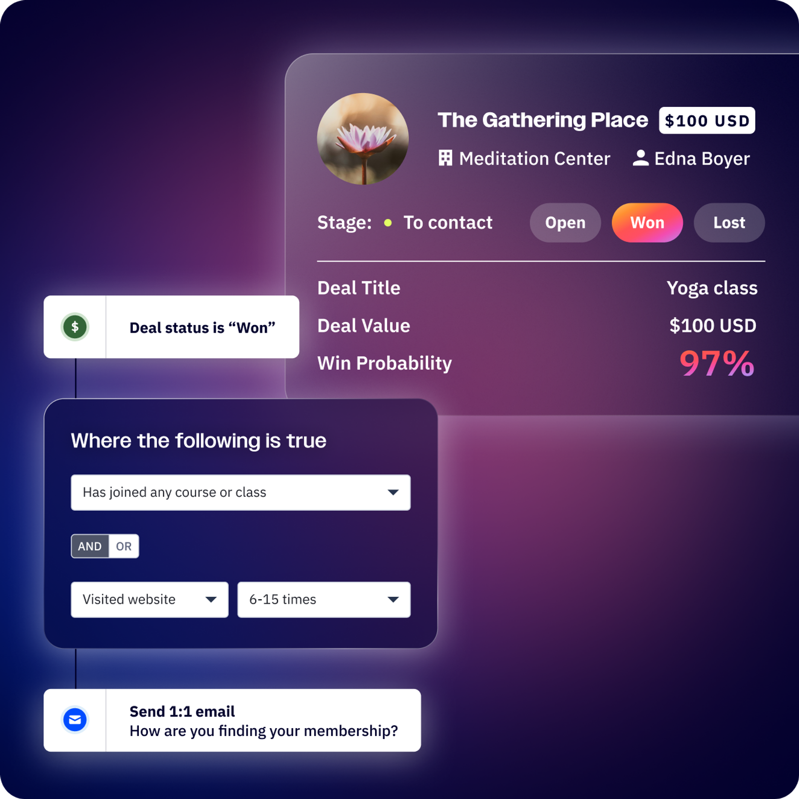 Tailor your outreach to meet your clients’ preferences. Create and send personalized messages that engage, convert, and build loyalty through email and texts. ActiveCampaign helps you build campaigns that feel conversational, so your marketing always keeps your personal touch.