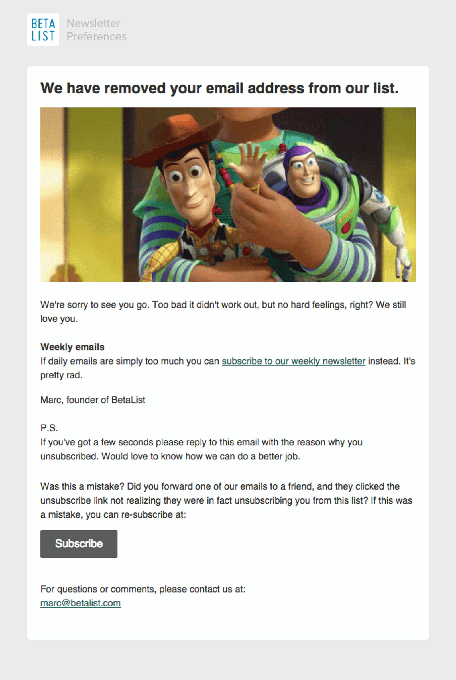 - Dai ai clienti il beneficio del dubbio. Ehi, errare è umano. A volte si sono disiscritti per sbaglio. BetaList include una CTA per iscriversi nuovamente... non si sa mai.