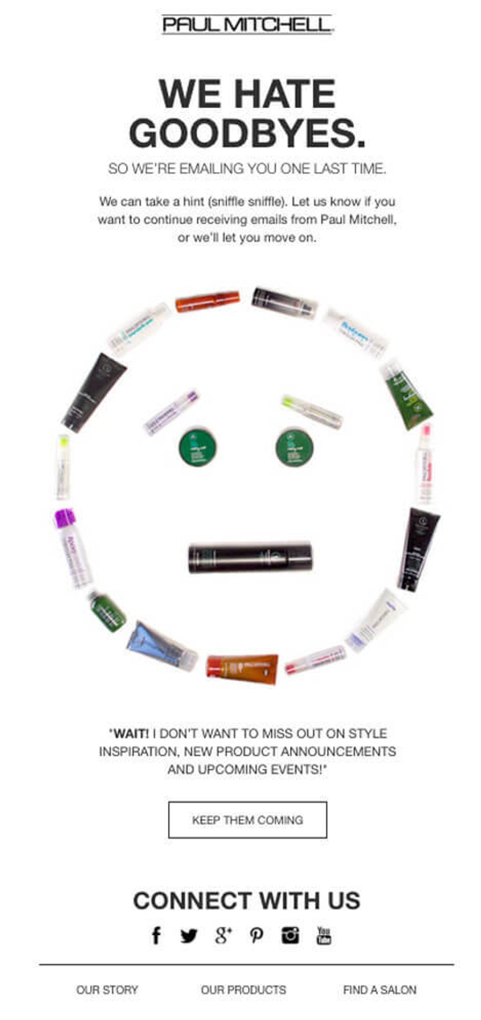 - Un po' di umorismo. L'argomento di questa email di Paul Mitchell sarà anche serio (il cliente sarà rimosso dalla mailing list), ma il linguaggio e il design restano scherzosi. Non vogliamo far sentire in colpa nessuno, non bruciare i ponti con un tono d'accusa.