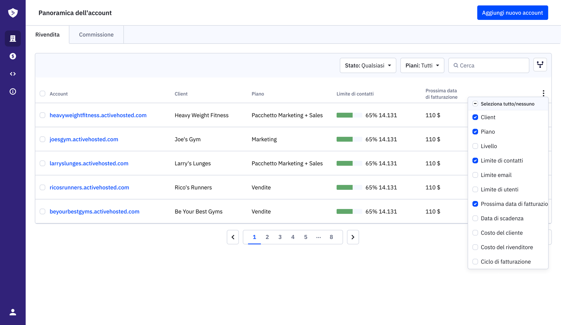 Perché è importante per la tua attività: quando devi gestire 20, 50 o più di 100 account cliente, ogni clic è importante. Il vecchio portale ti faceva navigare attraverso molteplici schermate solo per vedere i dati base del cliente: stato CNAME, termini di fatturazione e date di scadenza. Ora, tutto quello che ti serve compare in un'unica vista a cui ti basta dare un'occhiata veloce. Applica diversi filtri simultaneamente per trovare con precisione quali clienti richiedono attenzione: account in scadenza il prossimo mese, clienti con piani particolari o account che stanno raggiungendo il limite massimo di contatti.