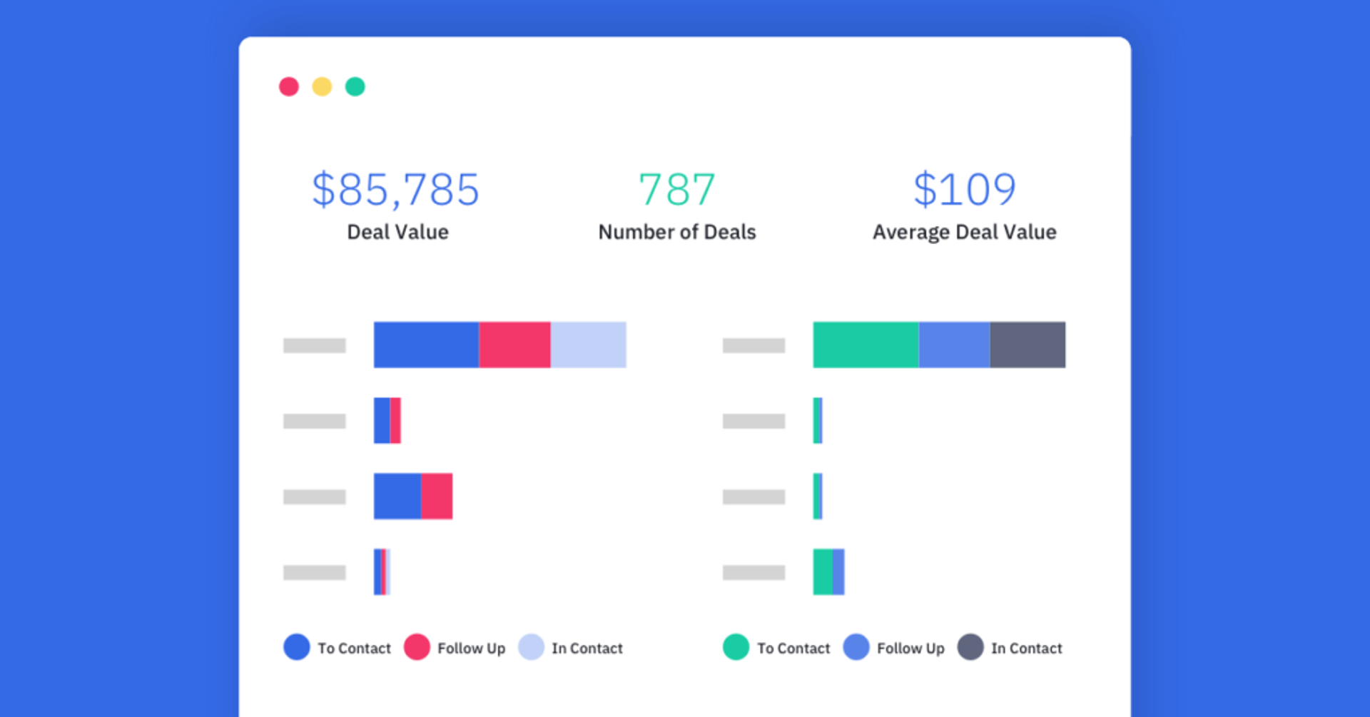 - Grafici a barre che mostrano il valore delle trattative in ogni fase e il numero di trattative per ogni rappresentante commerciale del team;