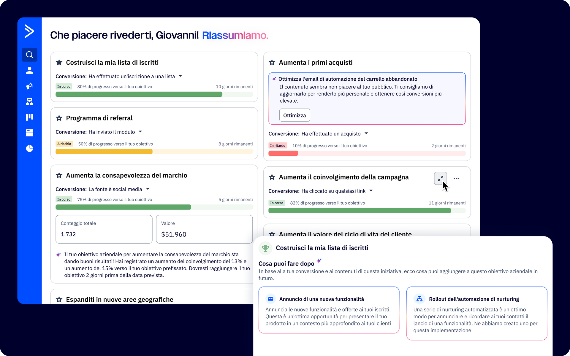 L'IA ti aiuta a eliminare le supposizioni dalla tua prossima campagna e ad adattare il tuo processo decisionale, restituendoti al contempo tempo per affrontare attività più strategiche. Con Business Goals di ActiveCampaign, i responsabili del marketing possono ottenere le informazioni e i consigli attuabili di cui hanno bisogno per avere successo.