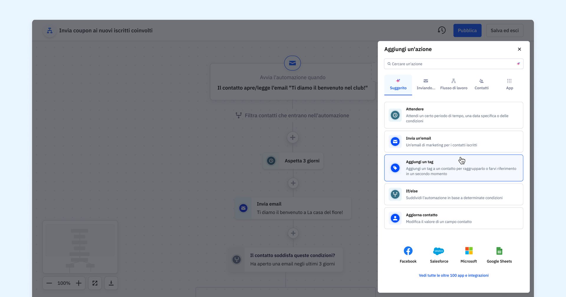 - Migliore reperibilità delle azioni: il menu aggiornato migliora la reperibilità delle azioni, rendendo più facile per te esplorare e selezionare le giuste azioni per la tua automazione, che tu sia principiante o un esperto di marketing.