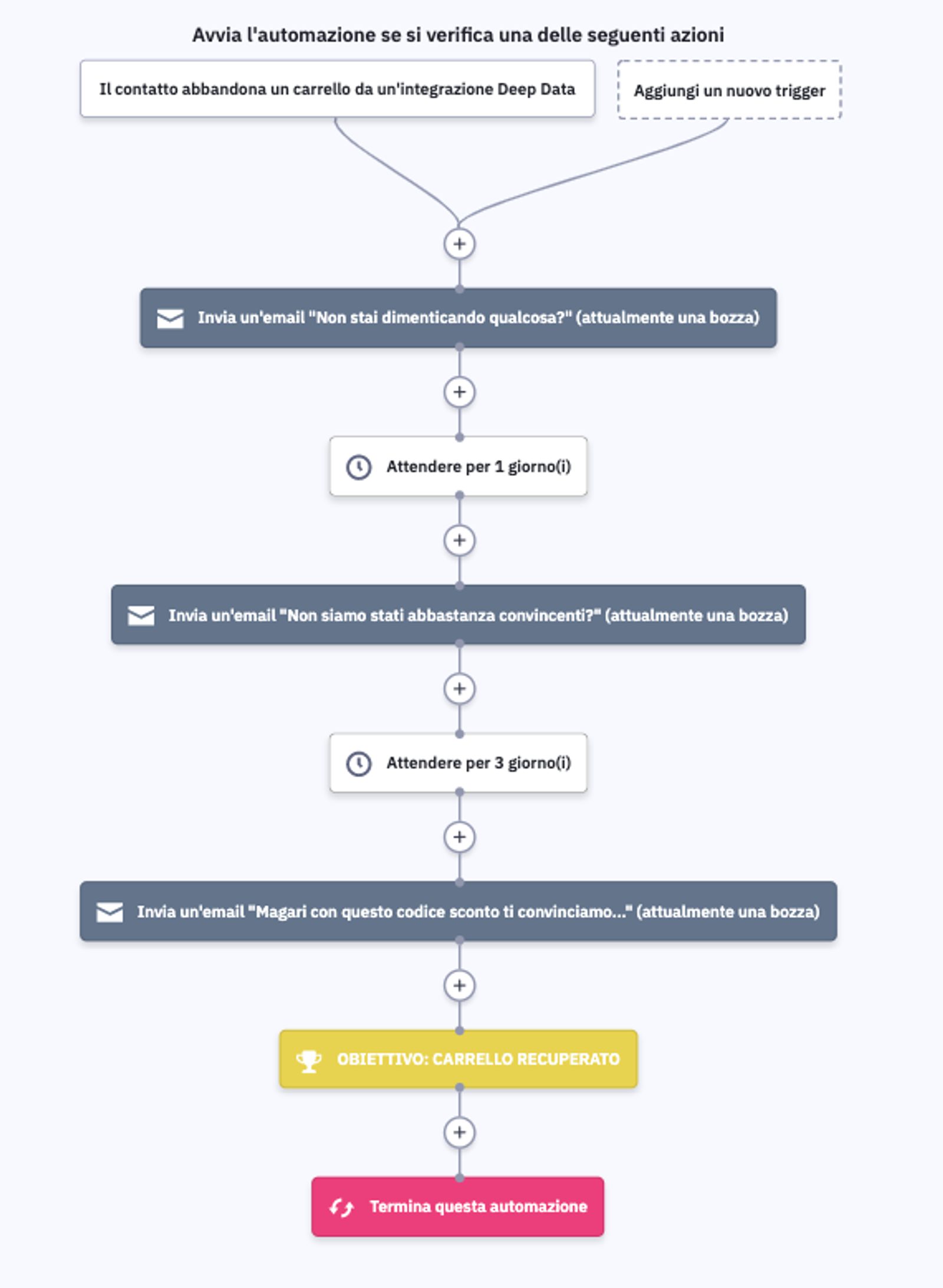 Se il contatto recupera il carrello dopo la prima email, non è necessario inviare le altre previste dal workflow. Questa impostazione può essere attivata usando il trigger obiettivo per fare in modo che i clienti non ricevano email inutili e per loro potenzialmente fastidiose.