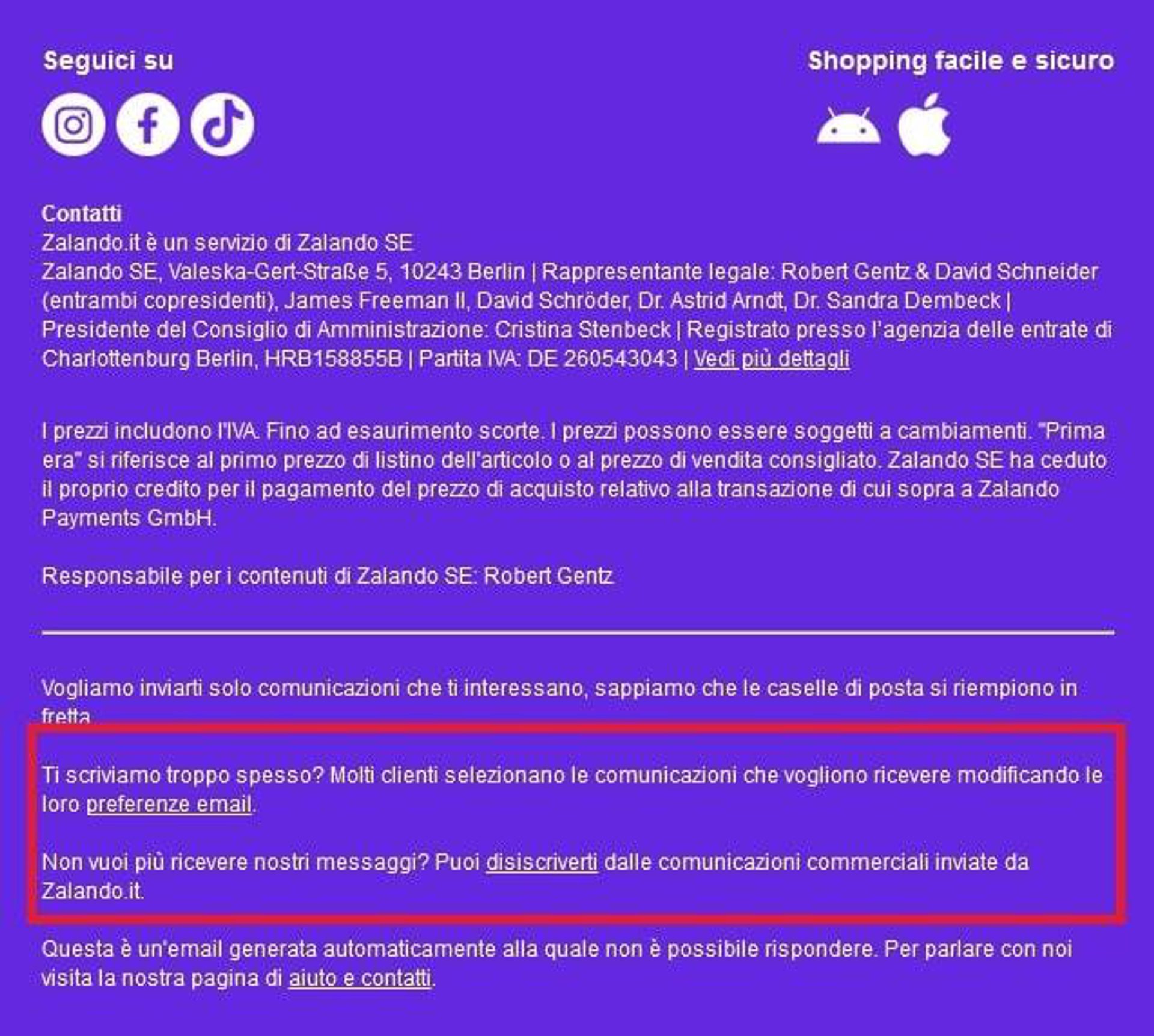 Ecco come Zalando Italia gestisce gli unsubscribe link e le preferenze nel footer.