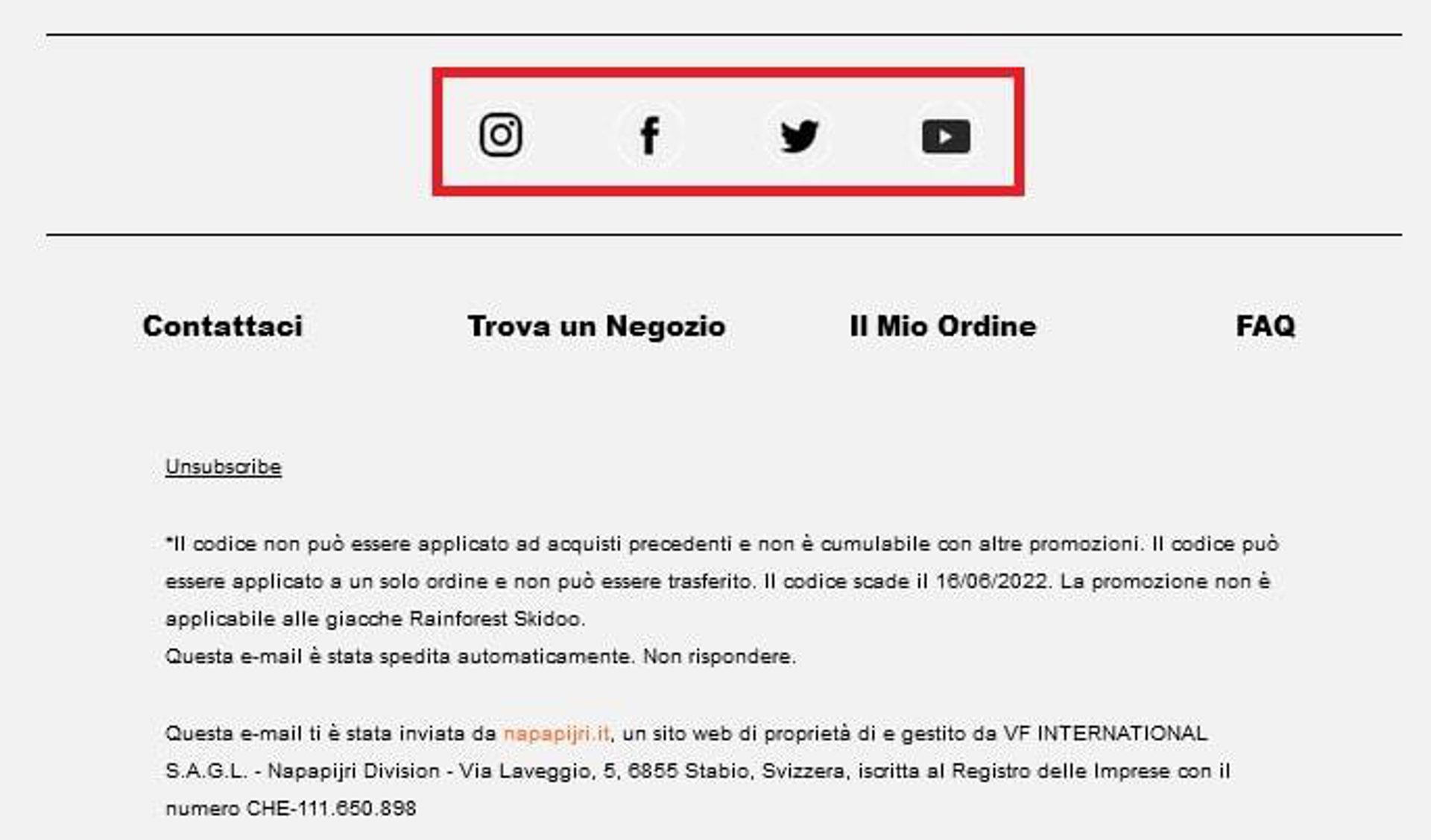 Guarda ad esempio Napapijri Italia: oltre a fornire i link social inserisce anche dei link al proprio sito web.