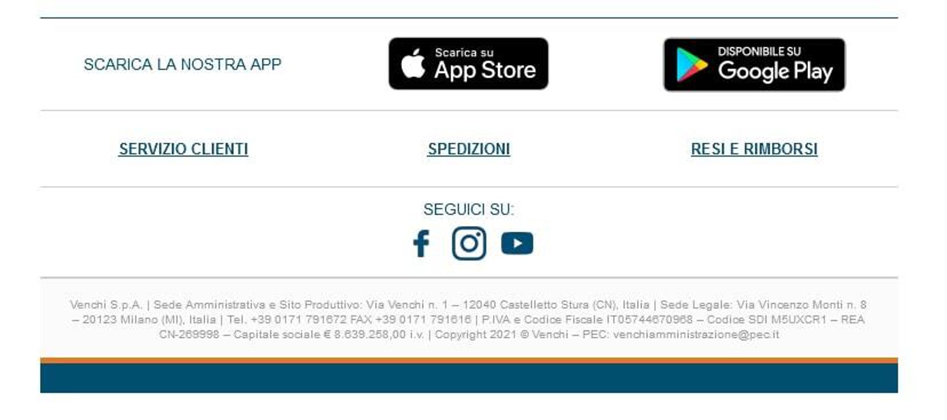 Ecco come Venchi gestisce i link alle app nel footer delle sue email.