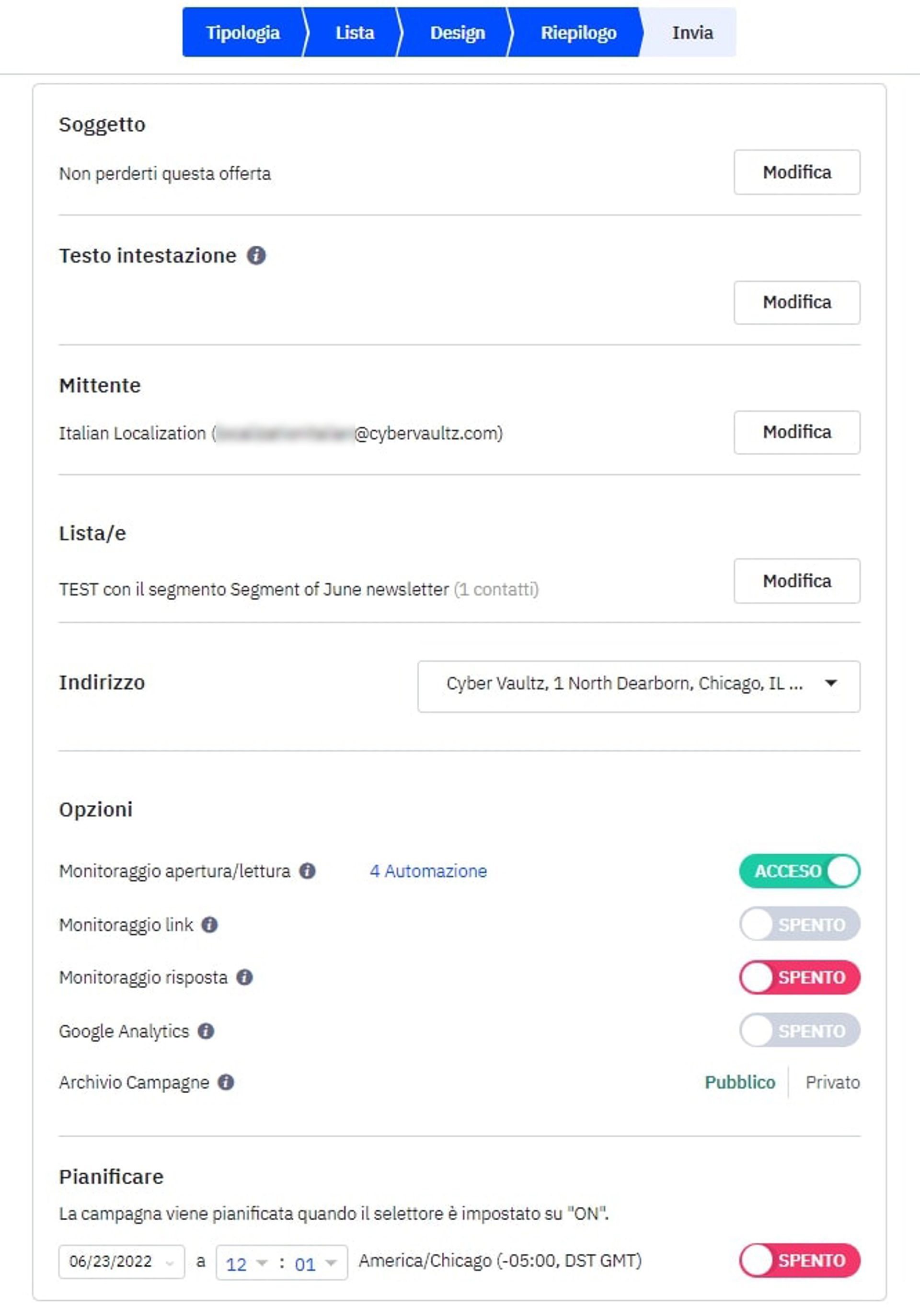 Con ActiveCampaign puoi utilizzare l’email footer predefinito disponibile e modificarlo ogni volta che desideri creare una nuova campagna, messaggio o modello. Una volta che hai personalizzato a tuo piacimento il piè di pagina, puoi salvarlo nella libreria e riutilizzarlo. Per sapere come effettuare questa operazione e come aggiungere il relativo blocco di contenuti nel modello, consulta l’articolo relativo alla modifica del piè di pagina predefinito. Per sapere come modificare l’indirizzo postale fisico dell’email footer, consulta invece l’articolo relativo alla creazione di intestazioni e piè di pagina personalizzati (nell’immagine qui sotto trovi dove modificare l’indirizzo).