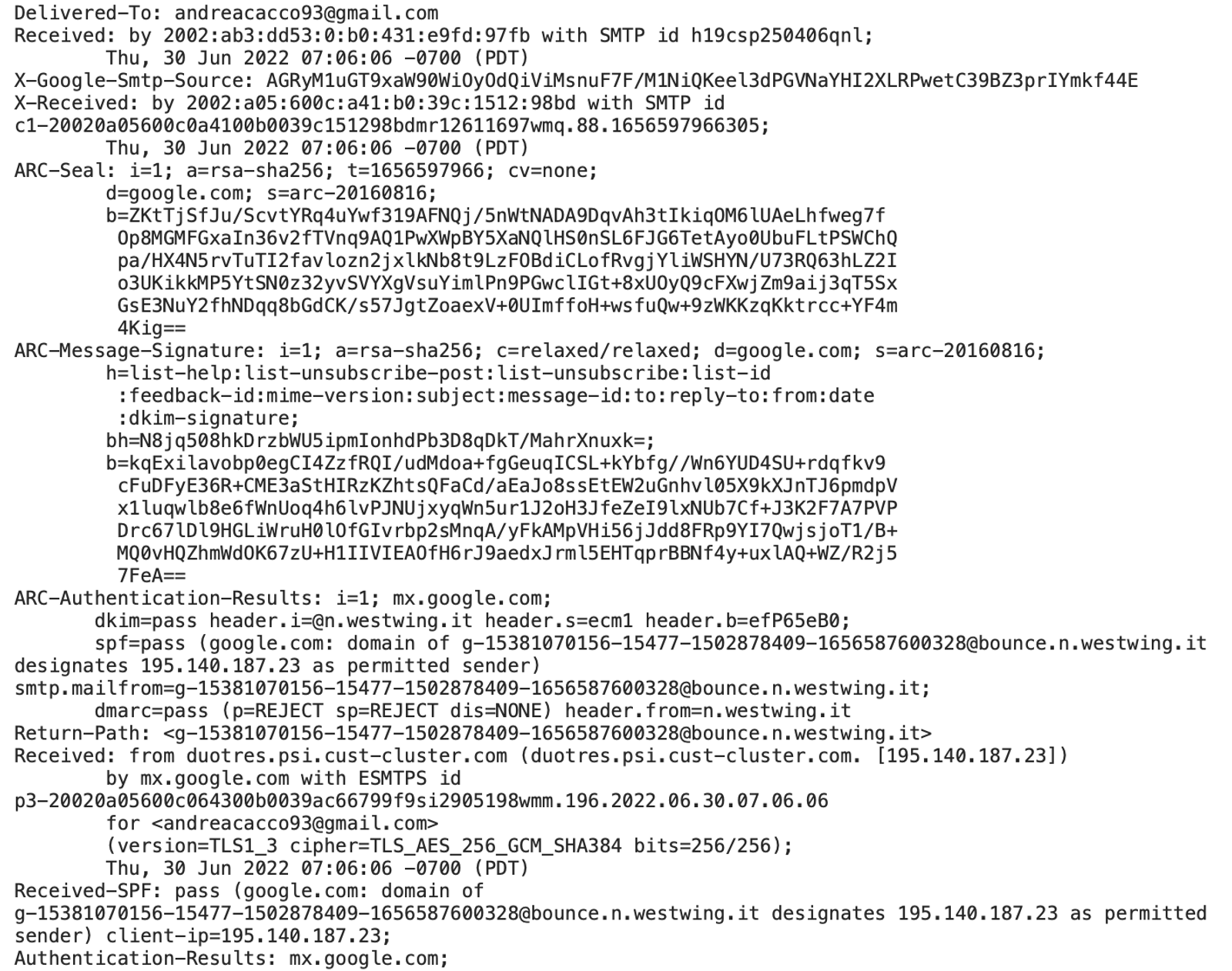 Vediamo ora quali sono gli elementi extra che possono essere estratti dal codice sorgente dell’email header per ottenere maggiori informazioni riguardo a ogni singola email inviata.