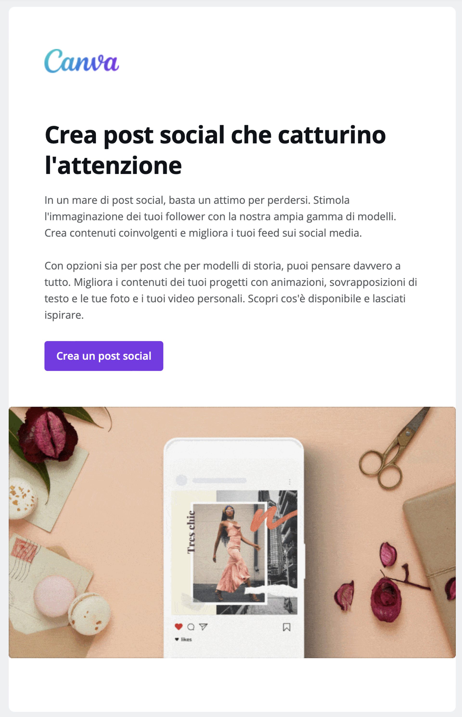 Canva adotta uno stile incentrato sulla semplicità anche per quanto riguarda le proprie comunicazioni.