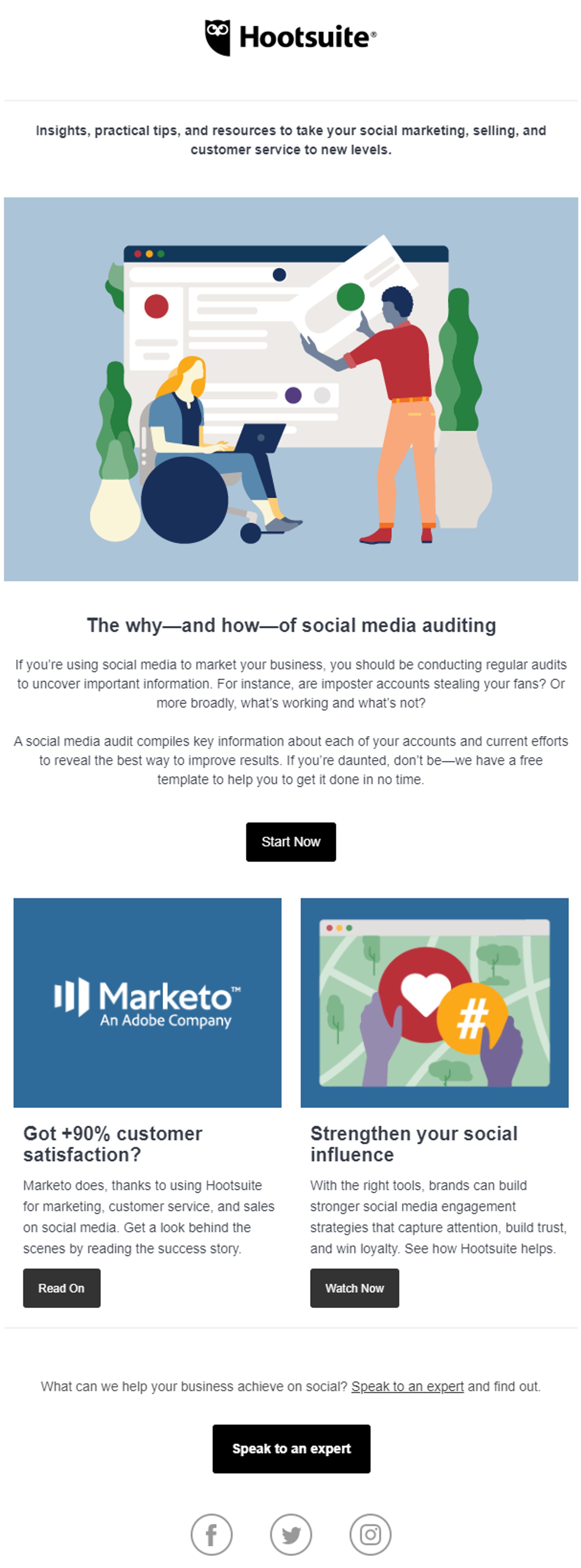 La struttura dell’email di Hootsuite è semplice ed è incentrata su un testo che include delle domande specifiche il cui scopo consiste nello stimolare la curiosità del pubblico B2B per spingerlo a fare clic sulla CTA e accedere al blog. Gli elementi presenti all’interno della newsletter corrispondono a quelli del blog in modo tale da creare continuità e non confondere l’utente.