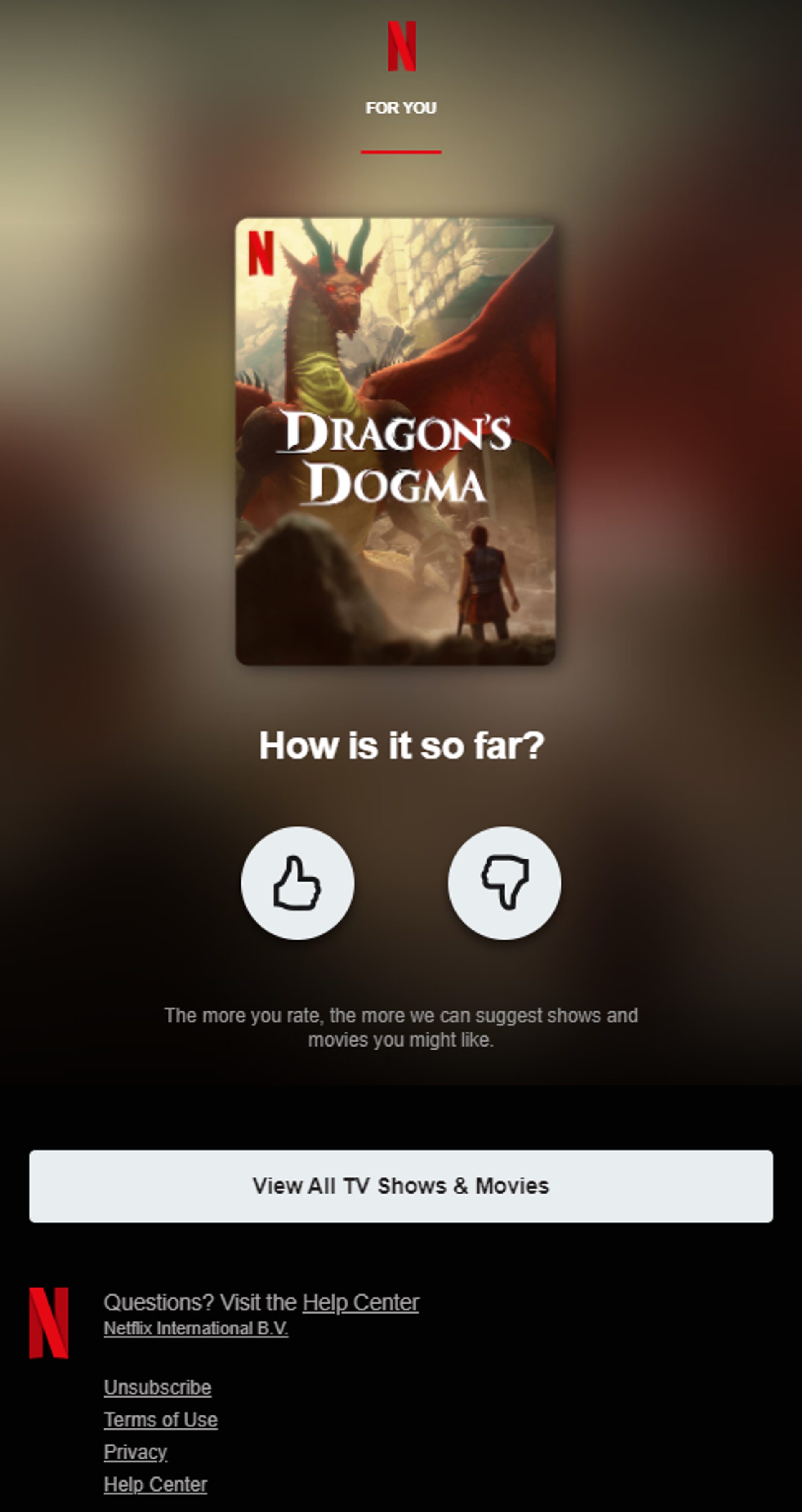 La campagna in oggetto presenta una CTA semplicissima: il nuovo abbonato non deve far altro che esprimere il proprio apprezzamento per la serie o segnalare di non averla apprezzata. Dopo aver espresso il proprio parere l’utente viene reindirizzato sul sito, dove gli viene comunicato che la sua valutazione è andata a buon fine.