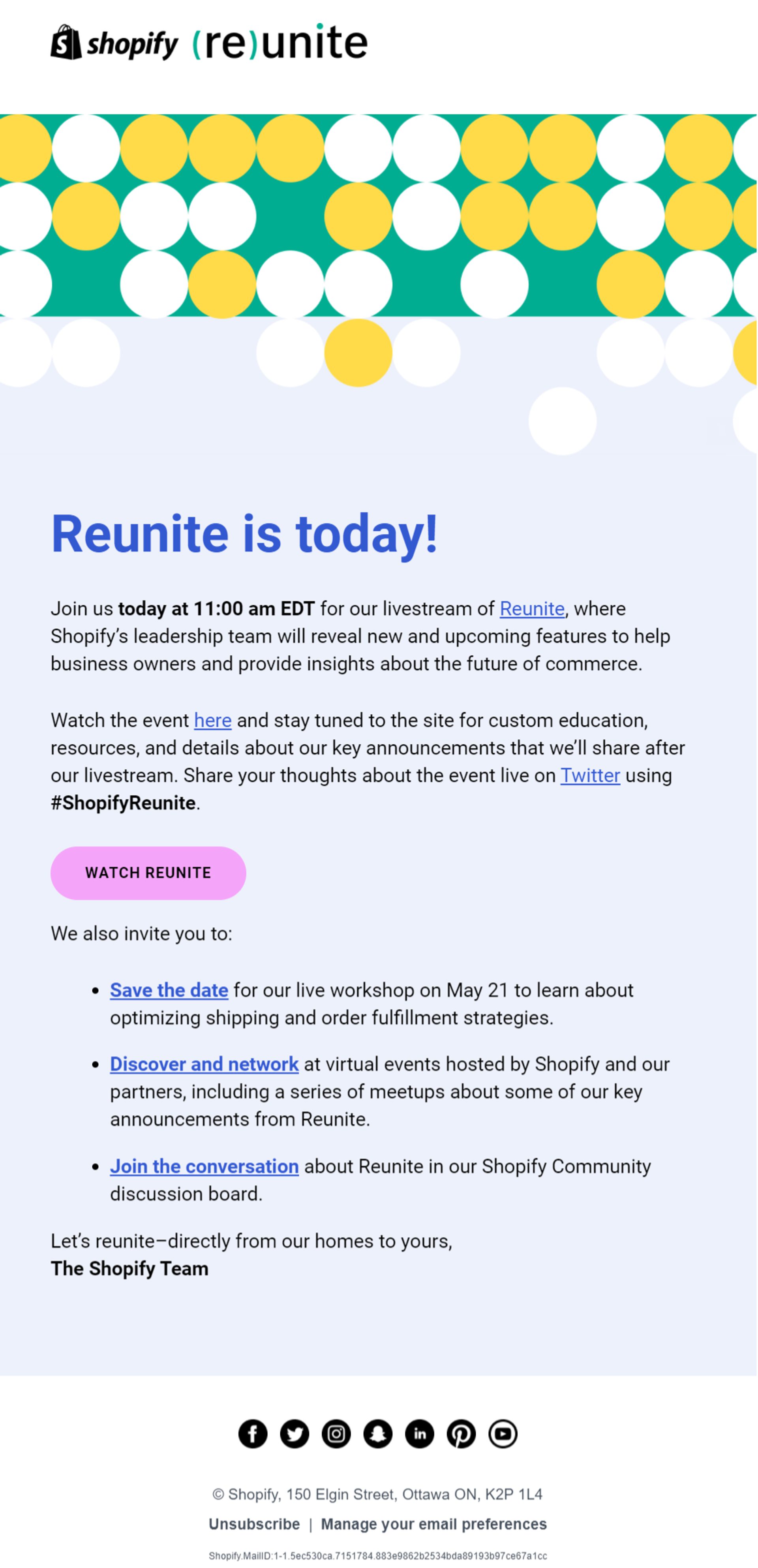 A chi non è mai capitato di dimenticare di partecipare a un evento, soprattutto online? Attraverso la sua email Shopify si assicura che questo non accada e cerca di convincere i suo utenti a partecipare al Livestream.