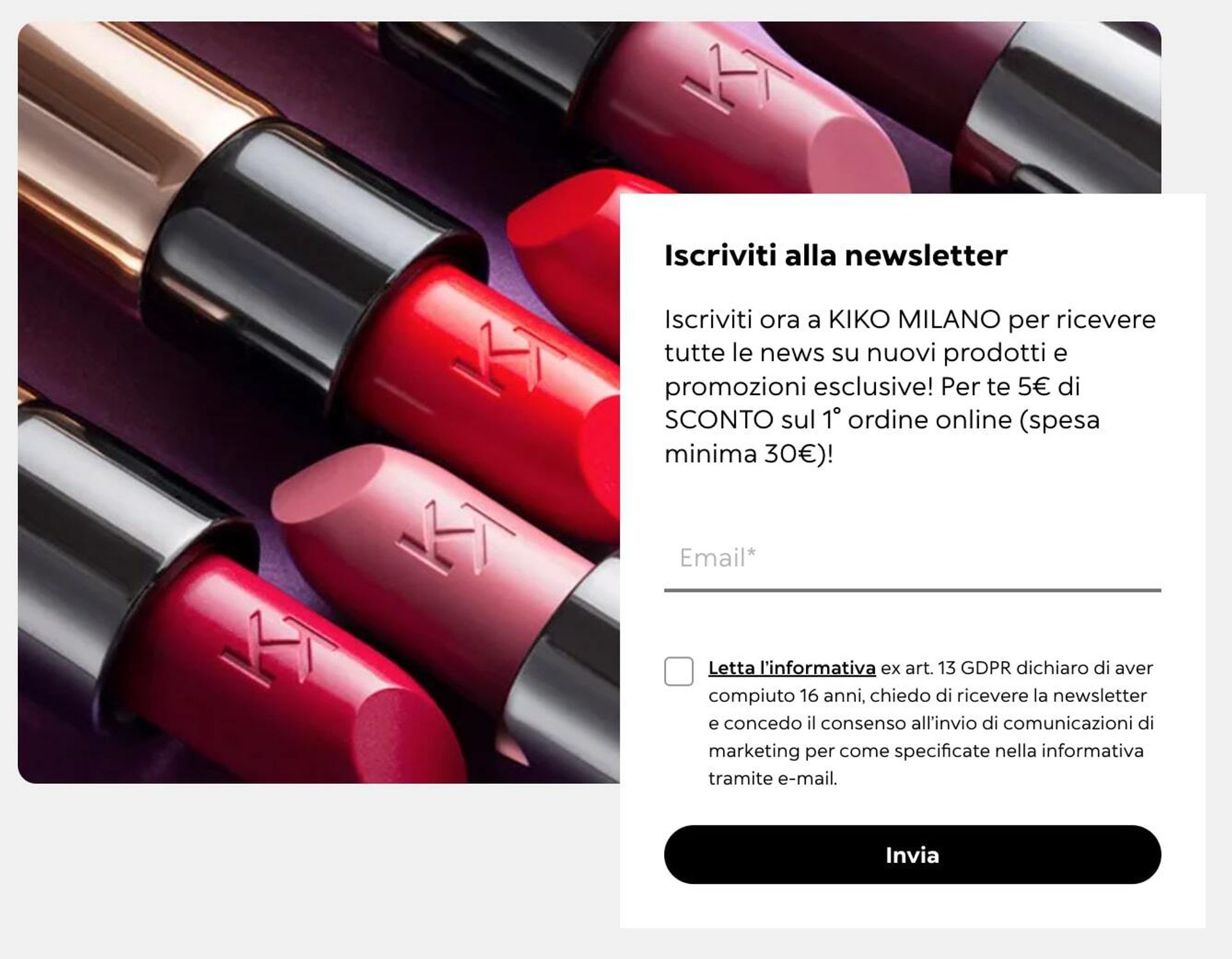 Kiko, il famoso brand di make up, utilizza un pop up email tanto semplice quanto efficace.