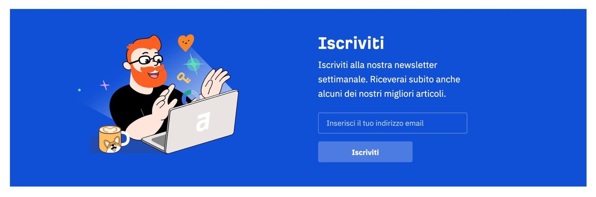 I visitatori sono invogliati a registrarsi alla newsletter per non perdere neanche un aggiornamento e così continuare a formarsi, con l’obiettivo di migliorare l’ottimizzazione SEO del loro sito web.