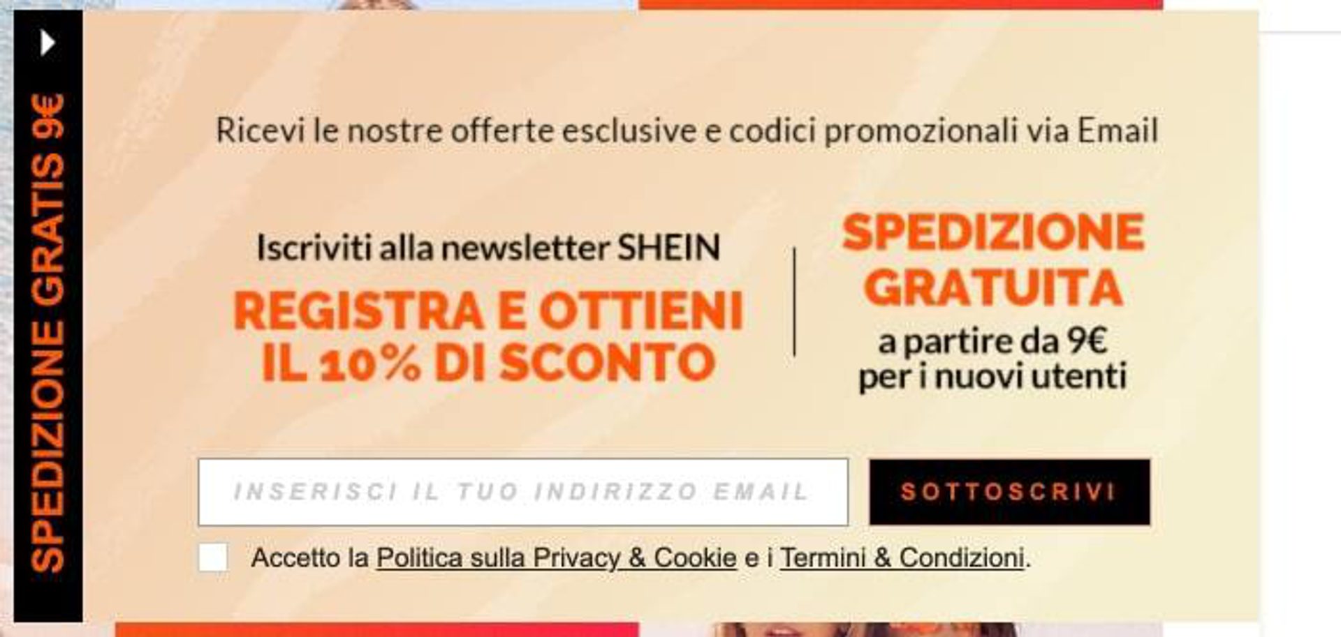 Questo pop up email del negozio online di fast fashion Shein si allinea perfettamente con il branding del sito.