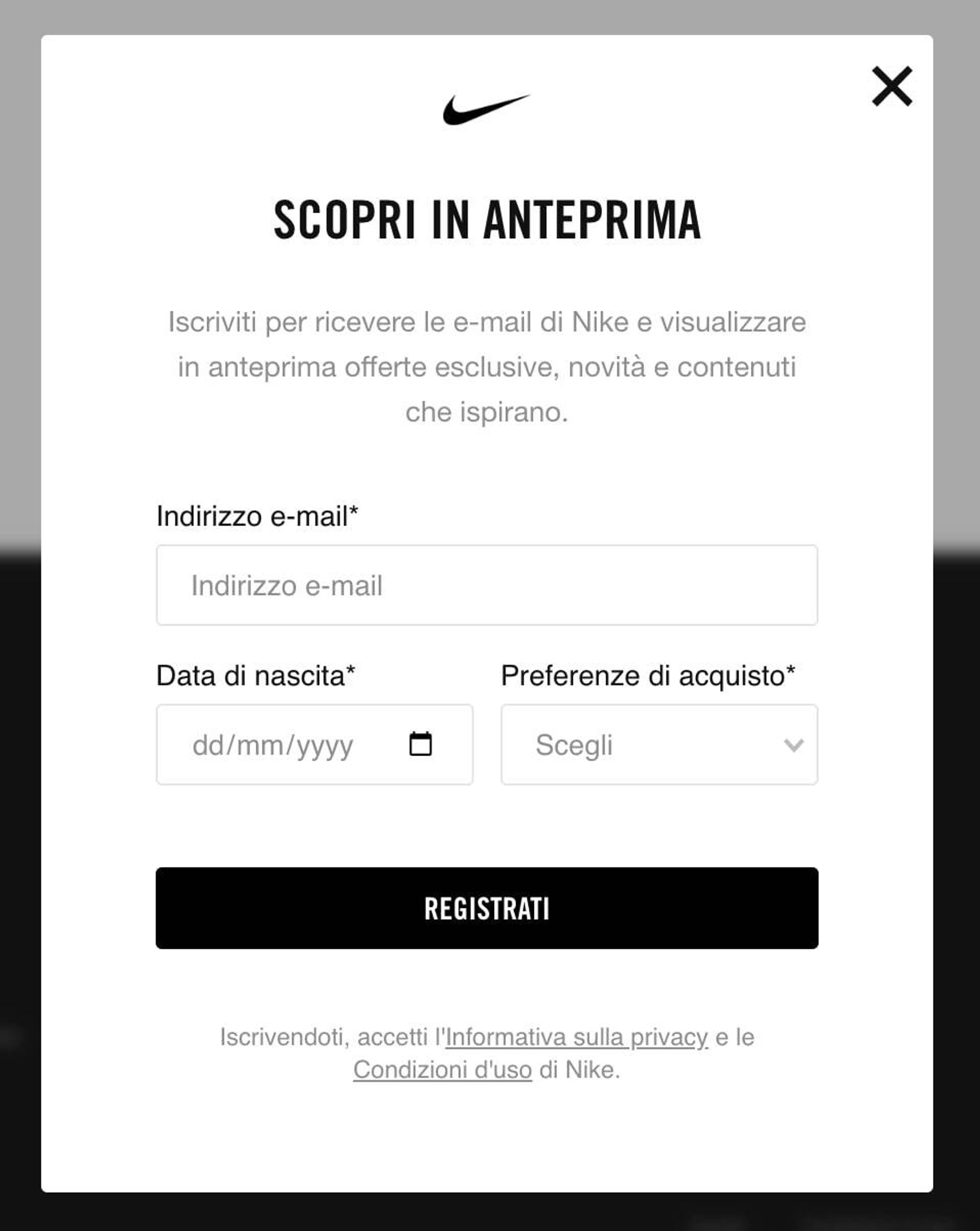 Il modulo di iscrizione di Nike è semplice e rispecchia i colori del brand.