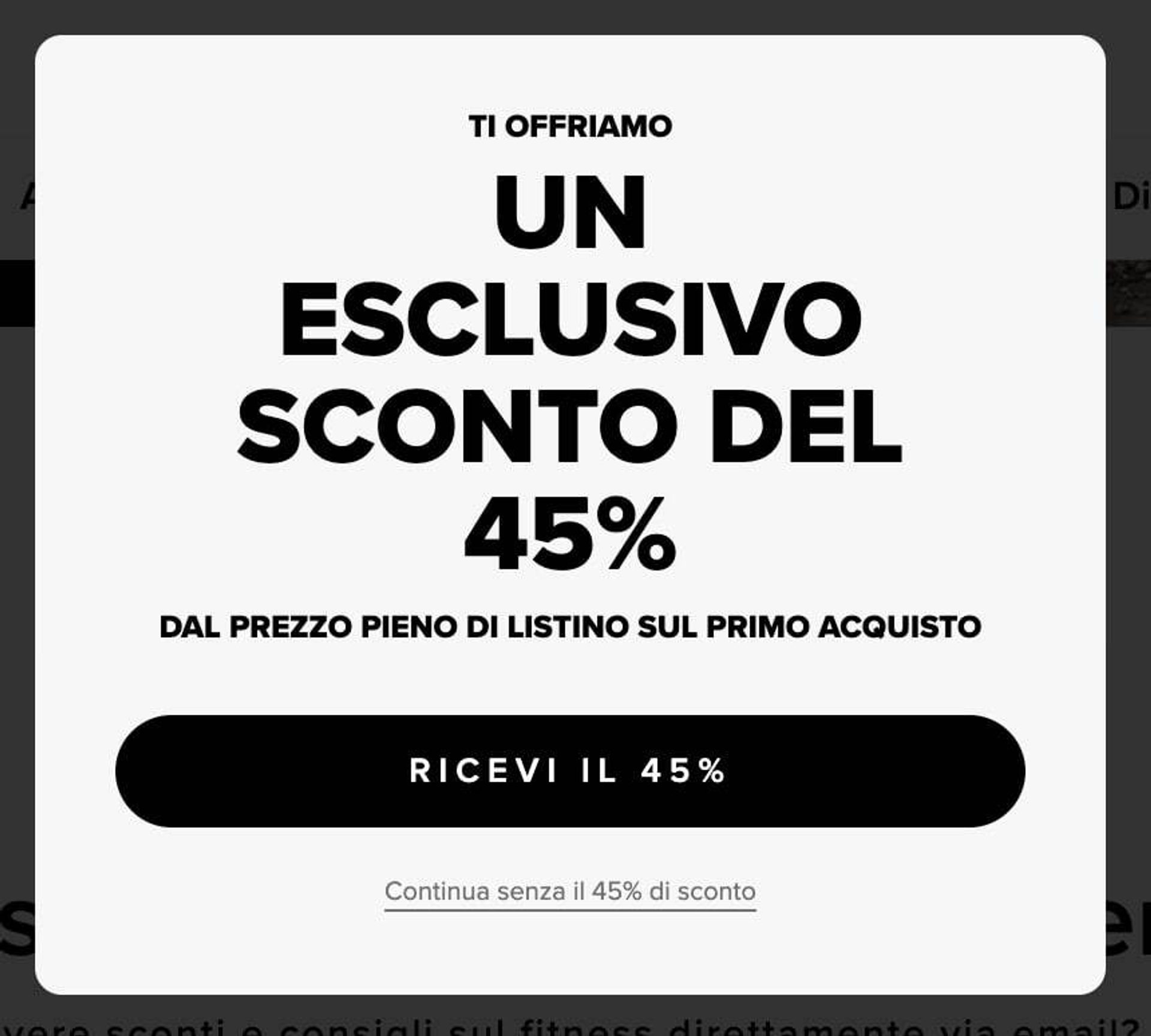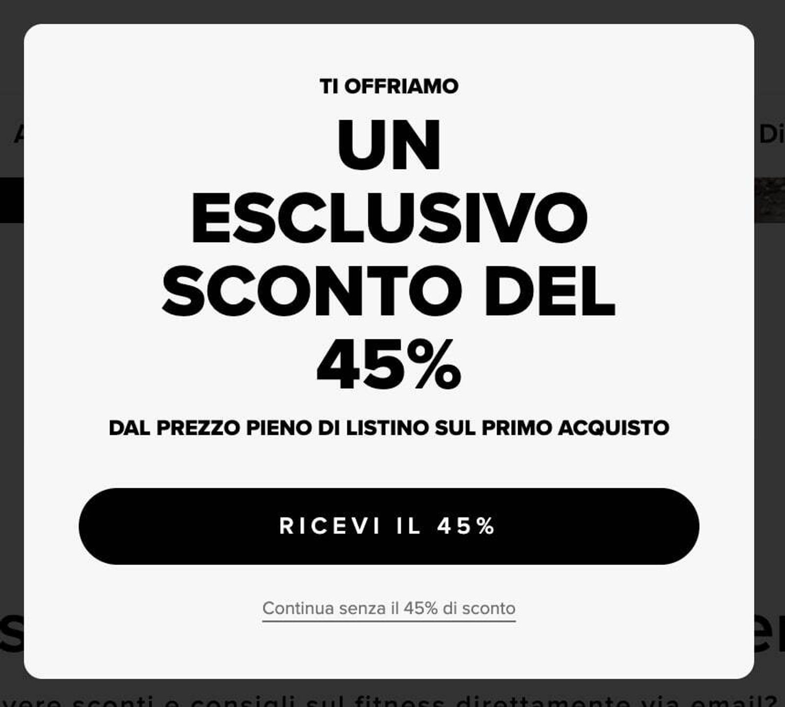 Questo pop up offre uno sconto a cui nessuno vorrebbe rinunciare e a prima vista sembra che l’utente debba solo cliccare sul tasto della CTA (d’altronde, chi cliccherebbe su “Continua senza il 45% di sconto”?).