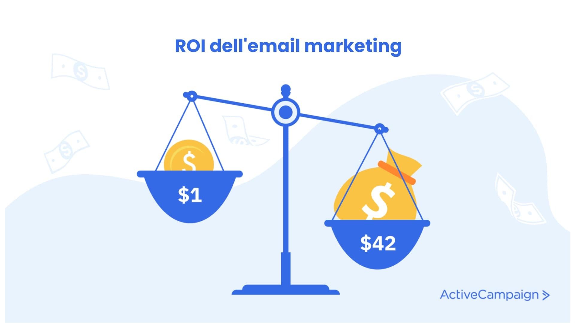 Questi sono solo alcuni dei motivi per cui il ROI dell’email marketing è più alto rispetto a qualunque altro canale, con una media di 42 $ per ogni dollaro speso (ovvero circa 39,50 € per poco meno di un euro).