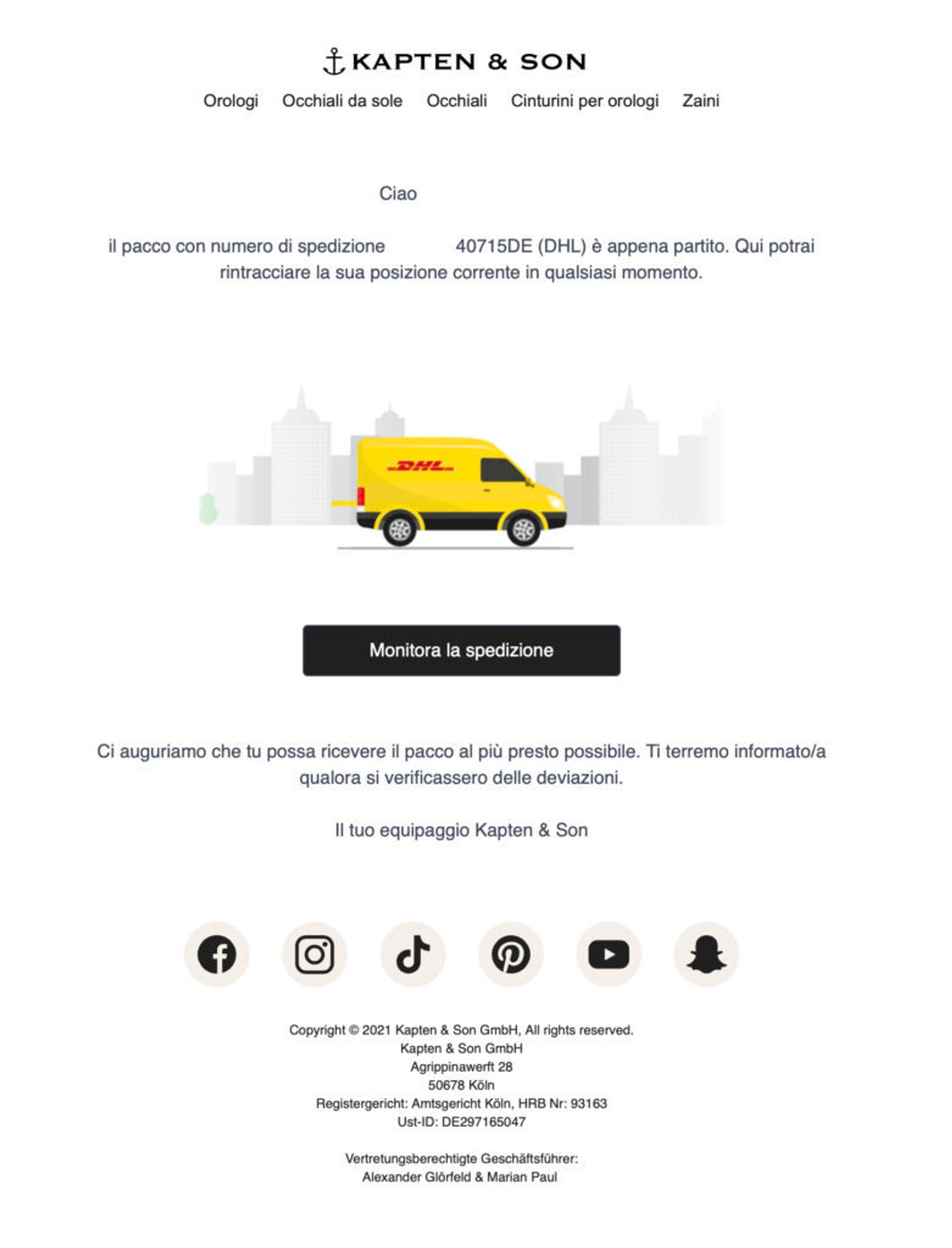 Abbiamo appena parlato dell’email di conferma ordine. Le tue comunicazioni post vendita con i clienti non possono fermarsi qui, ma devono continuare con un’email transazionale di tracciamento degli ordini.