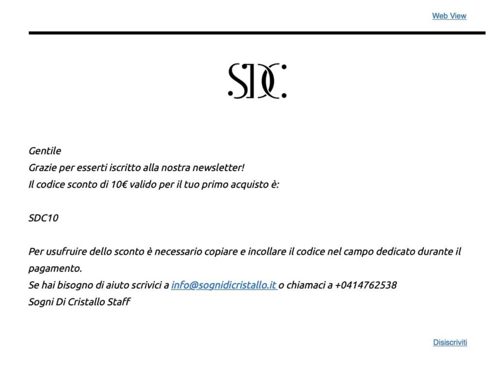 Il modo migliore per avere una relazione duratura con i tuoi clienti è accoglierli con un’email di benvenuto, o welcome email, al momento dell’iscrizione alla newsletter. In molti casi, le aziende decidono anche di includere in questa email un piccolo regalo ai propri iscritti, come ad esempio un 10% di sconto sul primo ordine.
