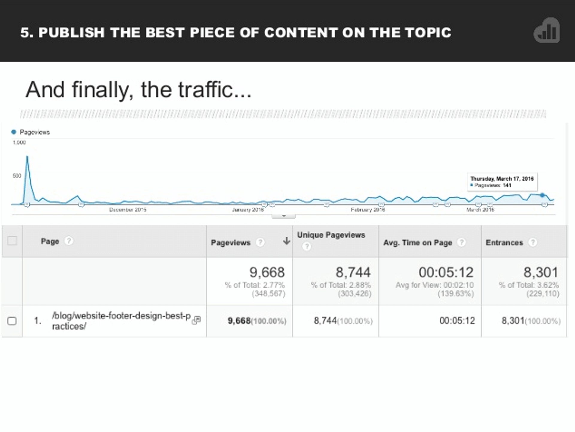 Questo è uno screenshot tratto da Google Analytics che il marketer di contenuti Andy Crestodina ha condiviso durante questo intervento e che mostra l'aumento di traffico iniziale dovuto alle email promozionali per i post di un blog.