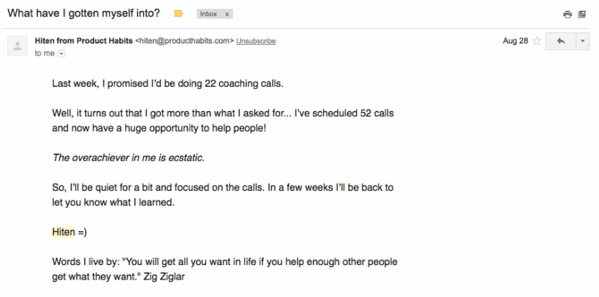 Hiten Shah, founder tra gli altri di Product Habits, Crazy Egg e Kissmetrics, aveva organizzato qualcosa di simile quando si era reso disponibile per sessioni di coaching gratuite, e i risultati hanno dimostrato quanto questo approccio per trovare idee per una newsletter possa avere successo.